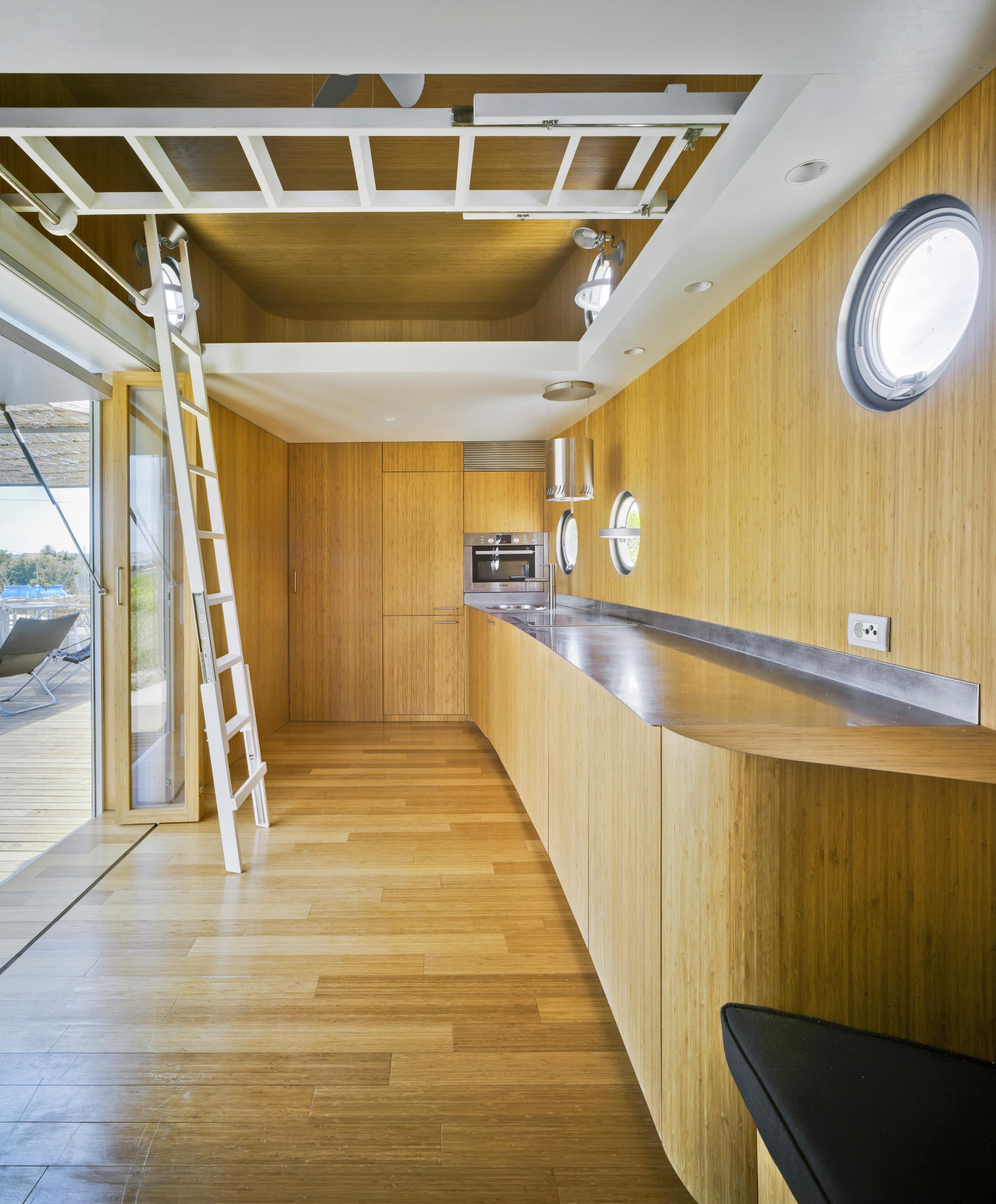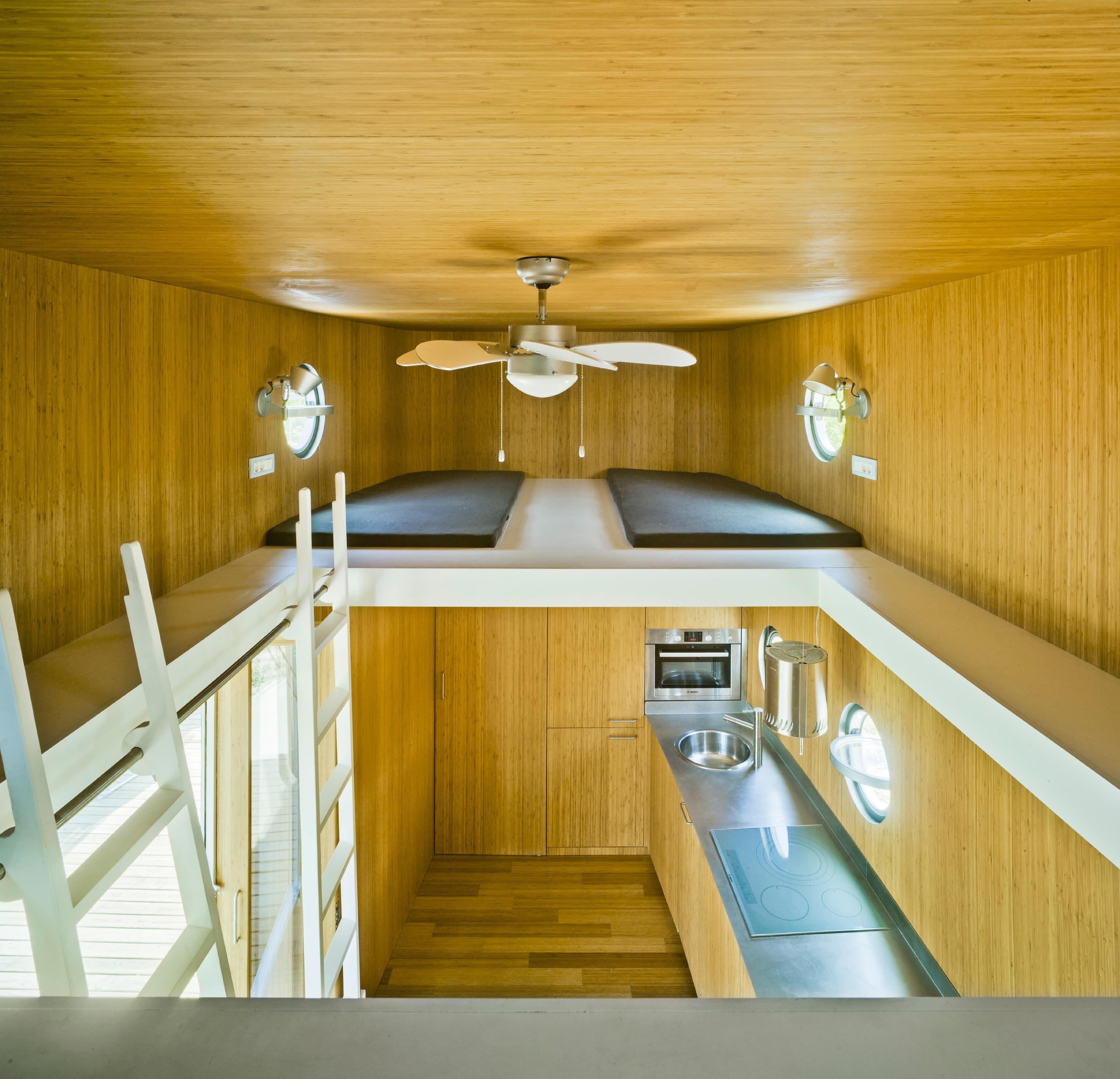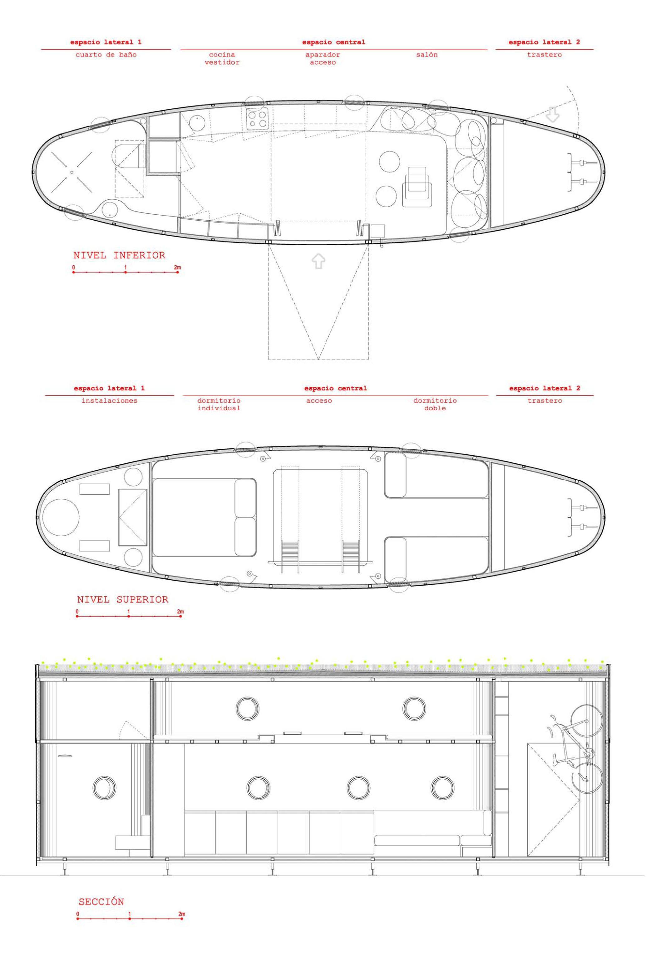 La machine home dispone de tres espacios básicos: uno central y dos laterales. El central se destina a las actividades domésticas compartibles. Un lateral se destina a los servicios higiénicos en planta baja y a las instalaciones en planta alta; el otro es un trastero en toda su altura. El espacio central, en planta baja dispone de todos los dispositivos necesarios para: cocinar, estar, comer y almacenar enseres domésticos o personales; el aseo dispone de lavabo, ducha e inodoro; y el trastero dispone de acceso independiente. En el centro existe un hueco de amplio tamaño por el que se accede a los dormitorios dispuestos en la parte superior mediante escaleras de barco.