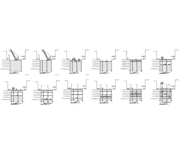 Los volúmenes de los cuartos de instalaciones, bombas, cuadros, etc., se agrupan junto a las salidas de planta y van pintados de negro. Sobre ellos, se rotulan las salidas de suelo a techo en blanco.