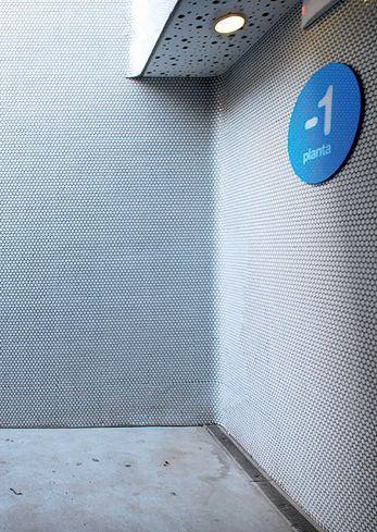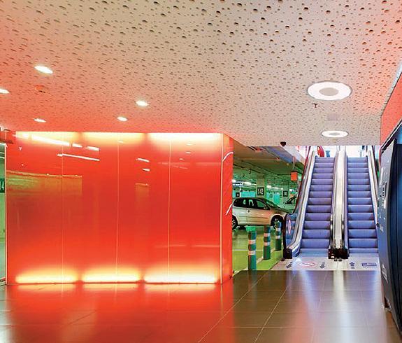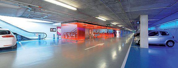Además de la diferenciación de las plantas por colores verde y azul, las cabinas de control están recubiertas de vidrio rojo retroiluminado. Se localizan fácilmente desde cualquier lugar del parking a pesar de la gran longitud en planta del edificio.