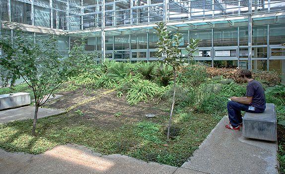Calidad ambiental: Un microclima para el patio interior. El patio interior se ha potenciado como corazón revitalizador, creando un jardín cuyo diseño está íntimamente relacionado con el microclima que la nueva piel fotovoltaica va a crear. Un microclima de menor radiación solar y mayor capacidad para retener agua y humedad, es decir, las características ideales para el bosque de ribera. Es por tanto un jardín frondoso pero autóctono y sin consumo de agua aportada.