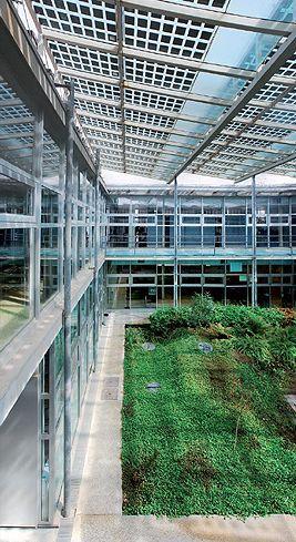Como consecuencia de lo anterior el BORM disfruta de un patio interior que aumenta la calidad ambiental del edificio, tanto visual como físicamente. Este jardín generado gracias a las nuevas condiciones medioambientales de la piel fotovoltaica y los nebulizadores, mejorará las condiciones del aire, ayudará a regular la temperatura y humedad, y servirá para crear un entorno de trabajo más agradable