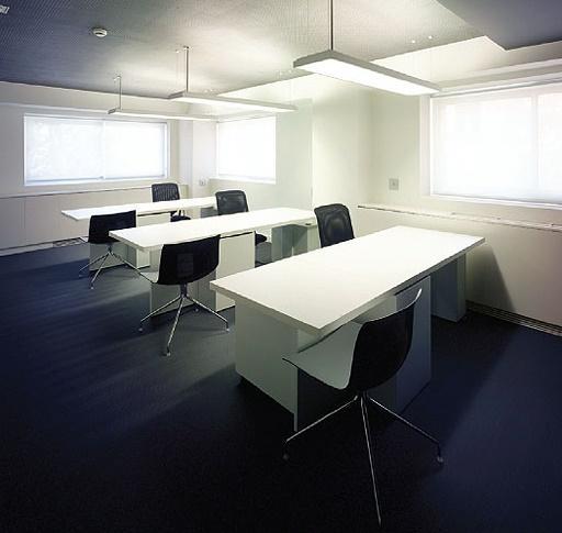 Al tratarse de unas oficinas con atención a público, preocupaba especialmente el comportamiento acústico y la iluminación de las estancias. El pavimento elegido para resolver esta cuestión ha sido una moqueta de PVC con textura; así mismo se han aplicado techos absorbentes acústicamente para evitar ecos y reverberación. En las zonas de tránsito se ha utilizado un pavimento de granito negro o mármol blanco y techos lisos.
