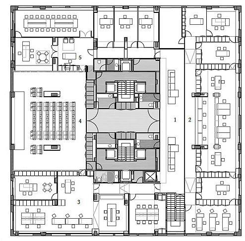 El local consistía en un espacio cuadrado que incorporaba los dos núcleos de escalera del edificio. Los dos núcleos se regularizaron,absorbiendo cuartos húmedos y espacios de almacén, y se utilizaron para la articulación del espacio, ya que delimitaban tres ámbitos diferenciados en los que se insertaban tres áreas funcionales: gabinete técnico, salón de actos, área de dirección. Perpendicularmente se dispone el eje de articulación y el Área de Visado y Gerencia.