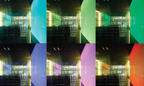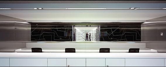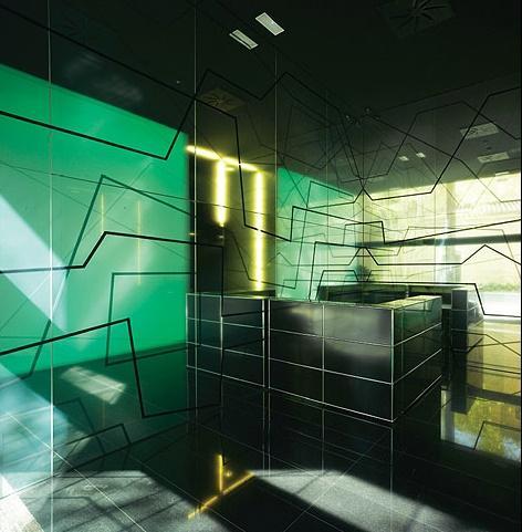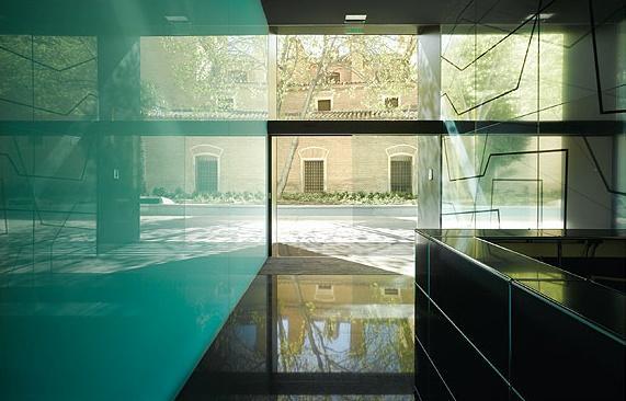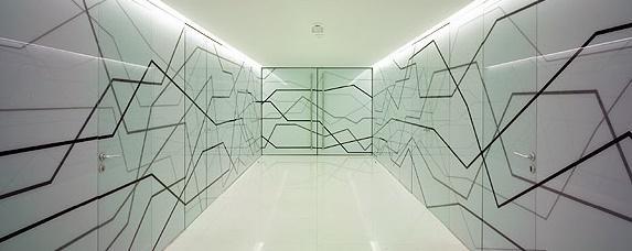 El núcleo central de la sede se ha revestido de vidrio laminado, que en su cara posterior reproduce el mismo motivo geométrico que el área de acceso, pero en este caso fondeado en negro o blanco según el área.