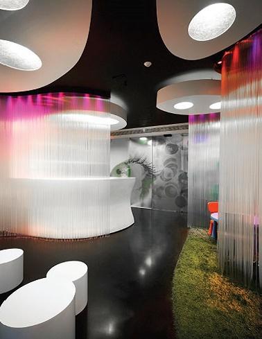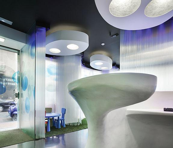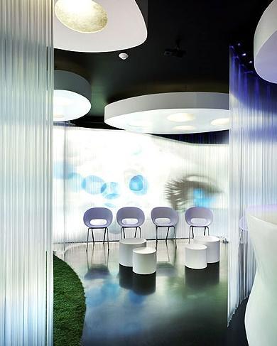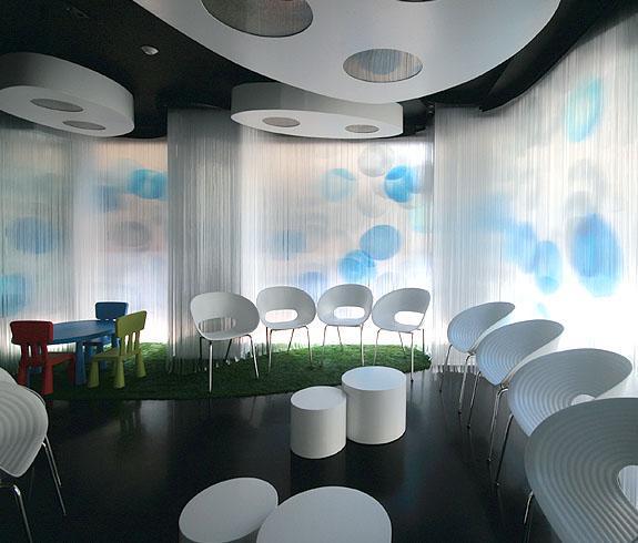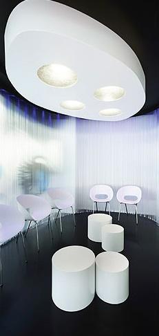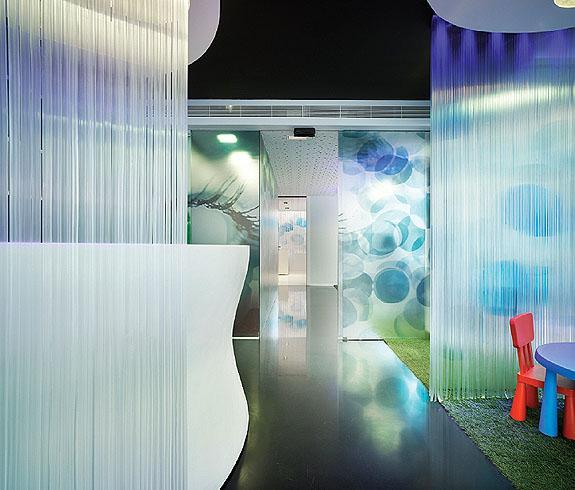 La sala de espera se configura mediante una doble piel que modela un espacio interior líquido convirtiéndole en un espacio armónico y de contorno blando que permite de día intuir el paso de los peatones de la transitada calle al tiempo que mantiene la intimidad interior.