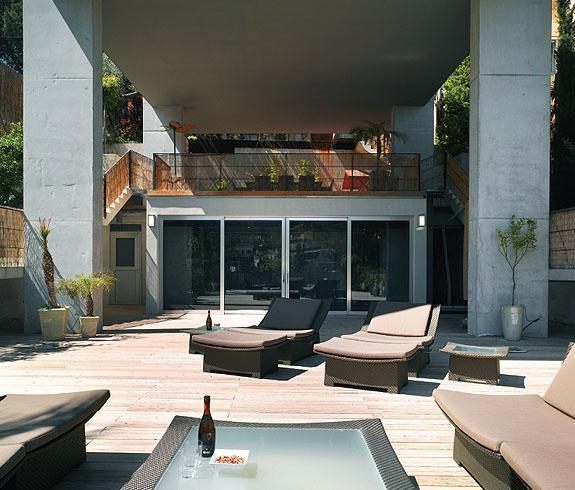 En un sótano independiente, separado para no perjudicar el carácter de mirador flotante sobre la ciudad que quiere la casa, se ubica una zona de baños, dando a una gran terraza, las instalaciones y una zona de utensilios para la jardinería.
