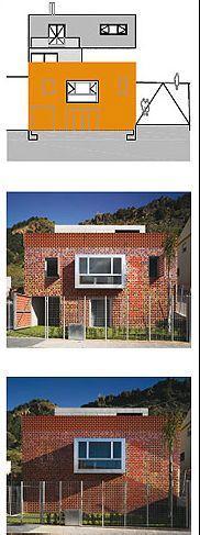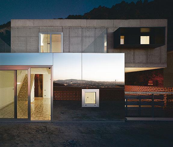 La casa tierra configura un zócalo del volumen total construido con piezas cerámicas combinadas con elementos de color. La casa cielo está compuesta de un volumen estructural de hormigón visto soportado por otro, en su parte inferior, acabado en vidrio espejo reflectante.