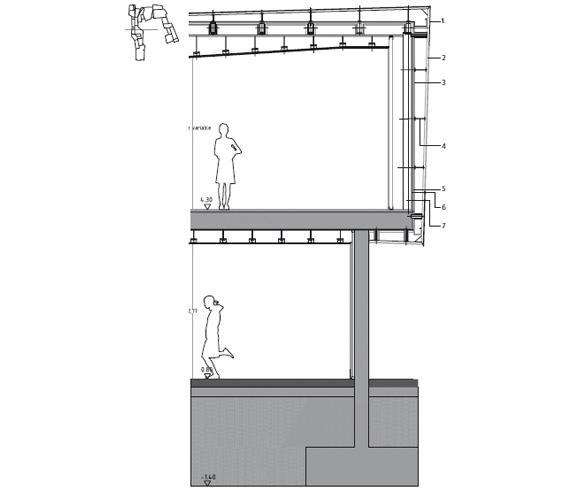 El edificio se construye en su planta baja con pantallas estructurales de hormigón visto y cierres metálicos. En su remate superior se ejecuta con una estructura metálica que resuelve los grandes vuelos y se cierra con un panel de múltiples hojas que queda sellado con una impermeabilización en caliente; se remata finalmente con una piel de acero corten perforada, que actúa como la capa final de una fachada transventilada que retoma el viejo asunto del clima como contexto.