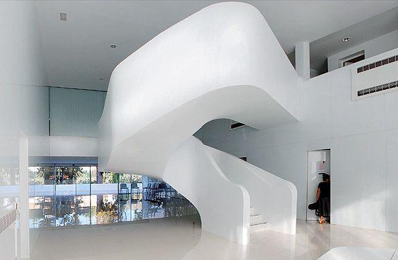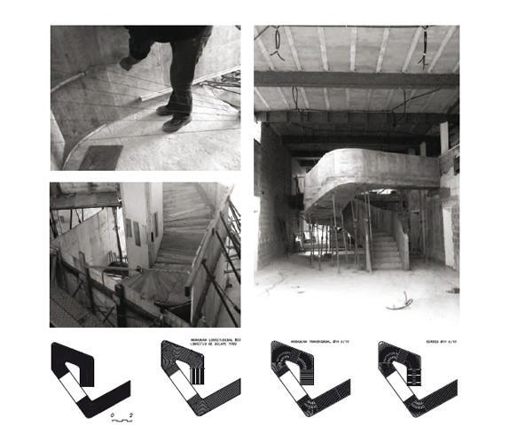 La escalera se ha realizado de hormigón armado íntegramente, la barandilla es continua en el exterior y en el interior aparece un pasamanos a una altura constante que provoca un efecto de movimiento.