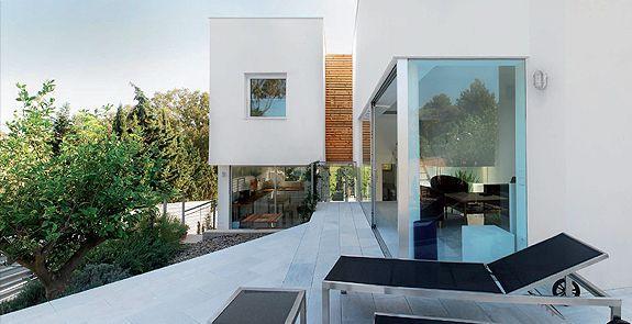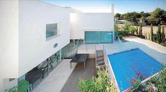 Dividimos cada vivienda en tres volúmenes blancos buscando el adecuado equilibrio entre ellos. Esta diferenciación favorece una mayor adaptación a la pendiente del terreno. Las conexiones entre ellos serán espacios de paso acristalados y protegidos con una celosía de madera de pino, que favorecerá a su vez una lectura ambigua entre lo que es interior o exterior al pasar de uno a otro.