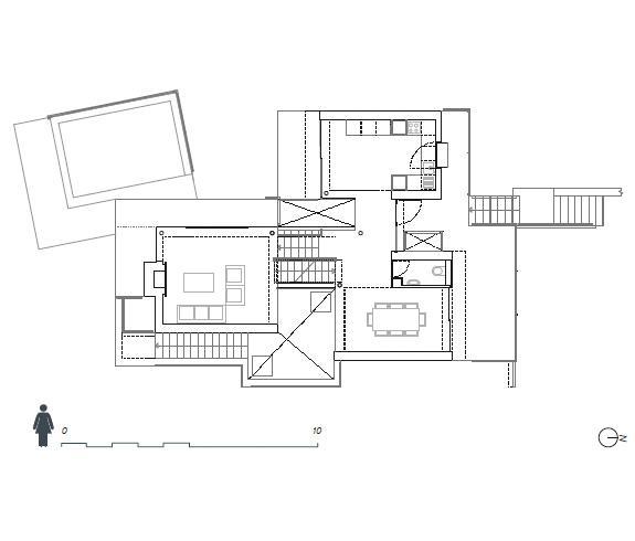 Cada volumen alberga una habitación diferenciada; en planta baja, las zonas de día (de mayor altura libre) corresponden al