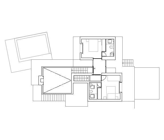 En planta alta, las zonas de noche, dos dormitorios y dos baños. Las escaleras son elementos lo más ligeros posibles para favorecer las vistas cruzadas. Una cuarta habitación, la alberca, de dimensiones parecidas al resto de las habitaciones viene a singularizar cada vivienda, al girar y adaptarse a cada parcela en busca de la mayor exposición solar.