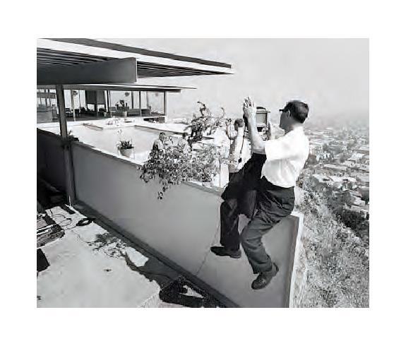 Nos recordaba la actitud del fotógrafo Julius Shulman fotografiando la casa Stahl (case study house nº 22, California 1960) sobre una de sus barandillas. Sensato en su actitud ya que pese al riesgo de buscar el encuadre más acertado, ha medido prudentemente todas las fuerzas encontradas (cabeza, pie, cámara, brazo, gafas) que obran en su poder compensándolas y manteniéndose en equilibrio.