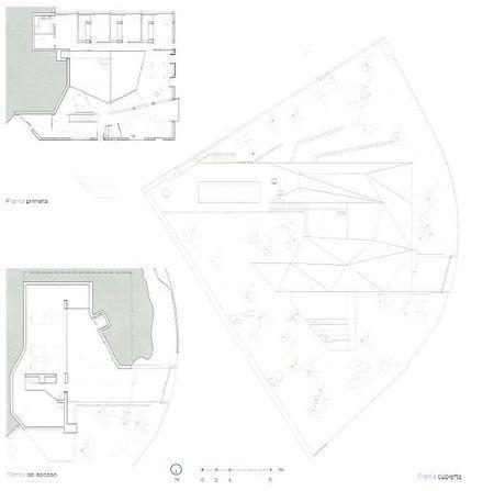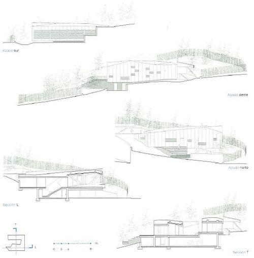 La zona inferior es un vaciado en la montaña, donde se incrustan los usos con menos necesidad de soleamiento y un acceso a la zona superior. Entre este acceso y el de la parcela, la sombra arrojada por la parte superior crea un vestíbulo suburbano, exterior y pensado para acceder en vehículo.