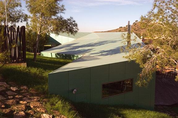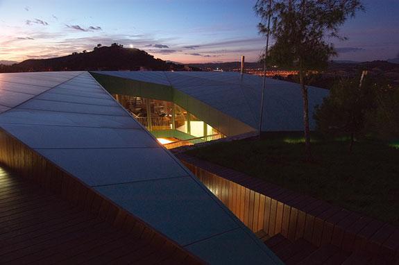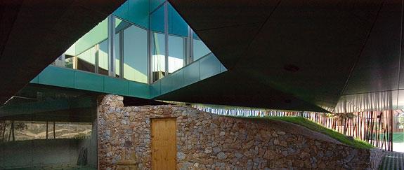 Esta zona despegada del suelo acaba en una cubierta acabada con el mismo material que las fachadas, que lo envuelve todo y que permite que el agua de lluvia escurra libremente hasta el suelo, aprovechándola como riego de la vegetación de monte bajo natural del terreno.