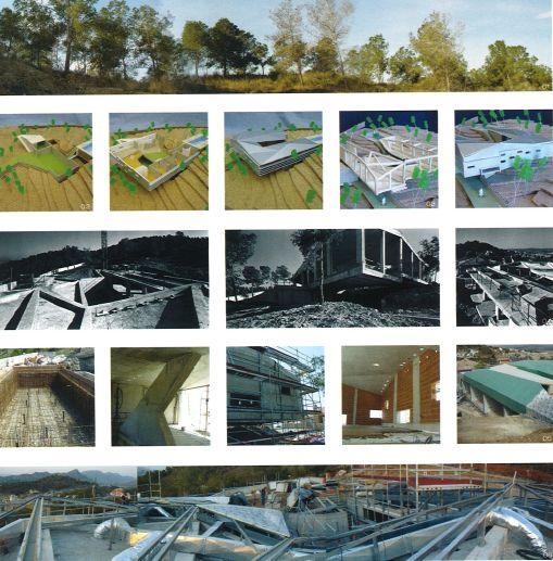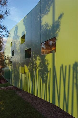 Aparece así una geometría poliédrica, revestida de acero tornasolado verde-azul, que se funde con el cielo y con los árboles, refleja los pinos cercanos y se eleva para que el suelo pase por debajo de ella..., ironía del lacónico "verdear" de Bruno Latour.