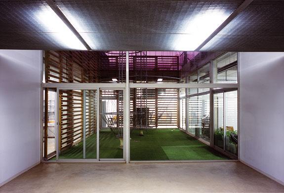 Es en este nuevo volumen bajo rasante donde se distribuyen las grandes áreas departamentales destinadas a laboratorios, talleres, etc. que por sus necesidades dimensionales, de instalaciones y de flexibilidad - para su posible evolución en el tiempo - se disponen también bajo el patio.