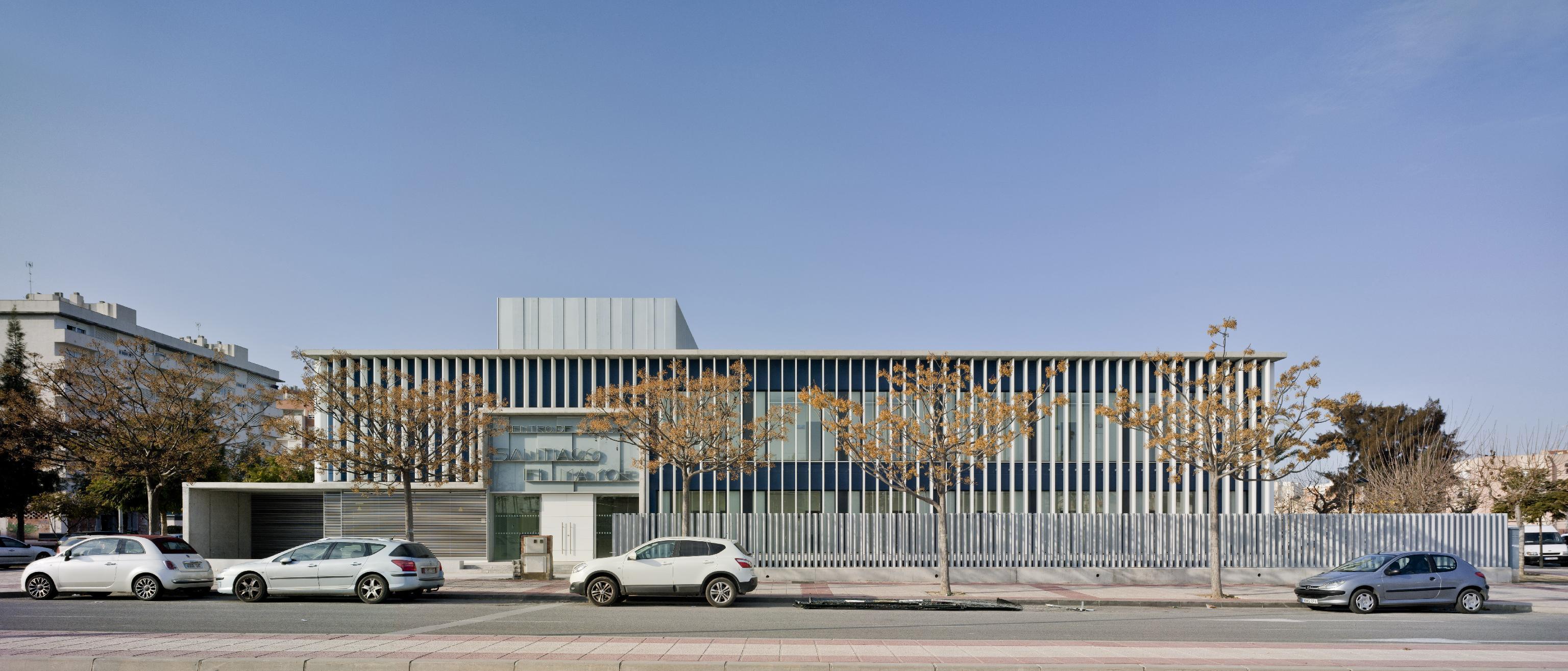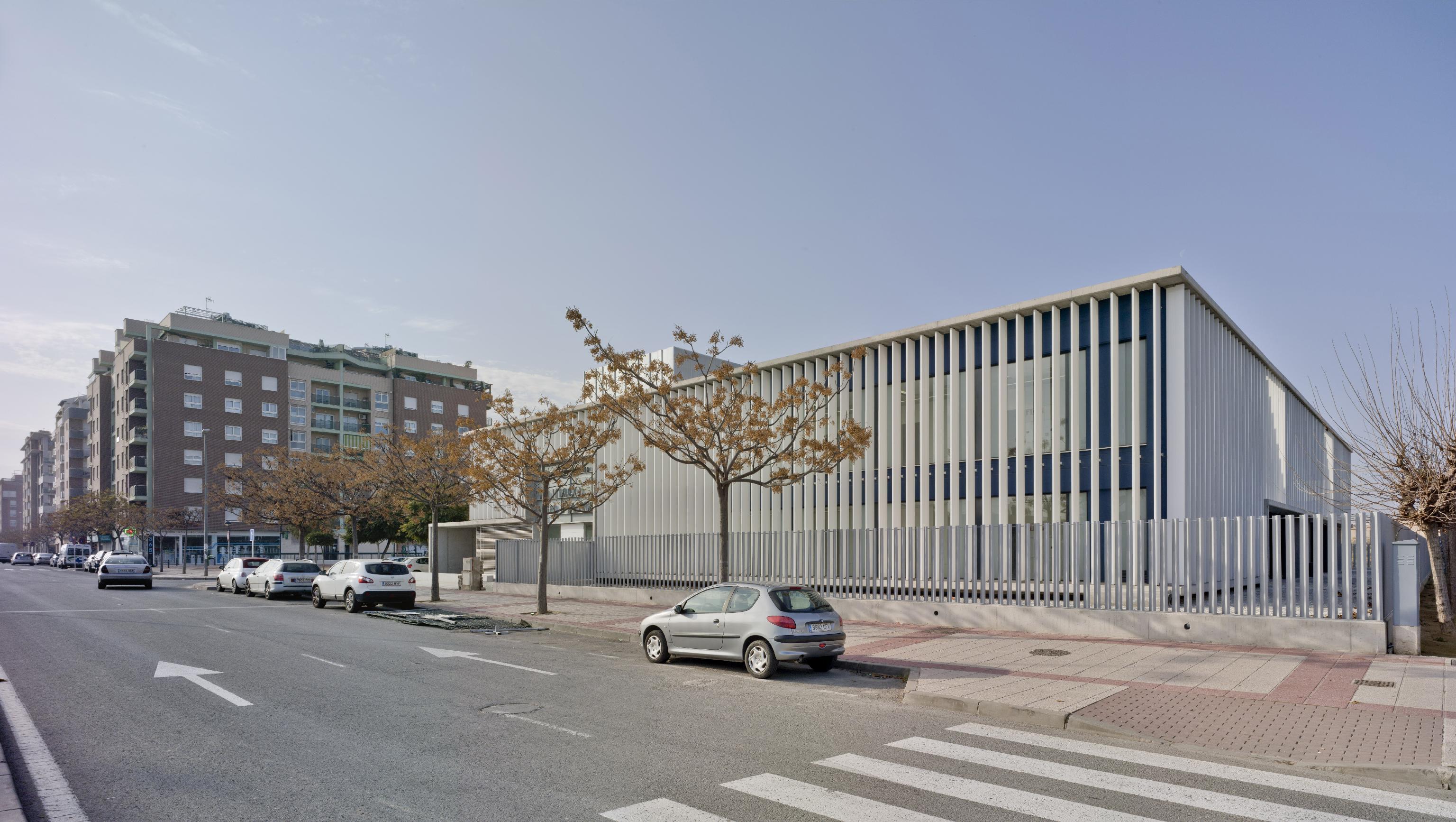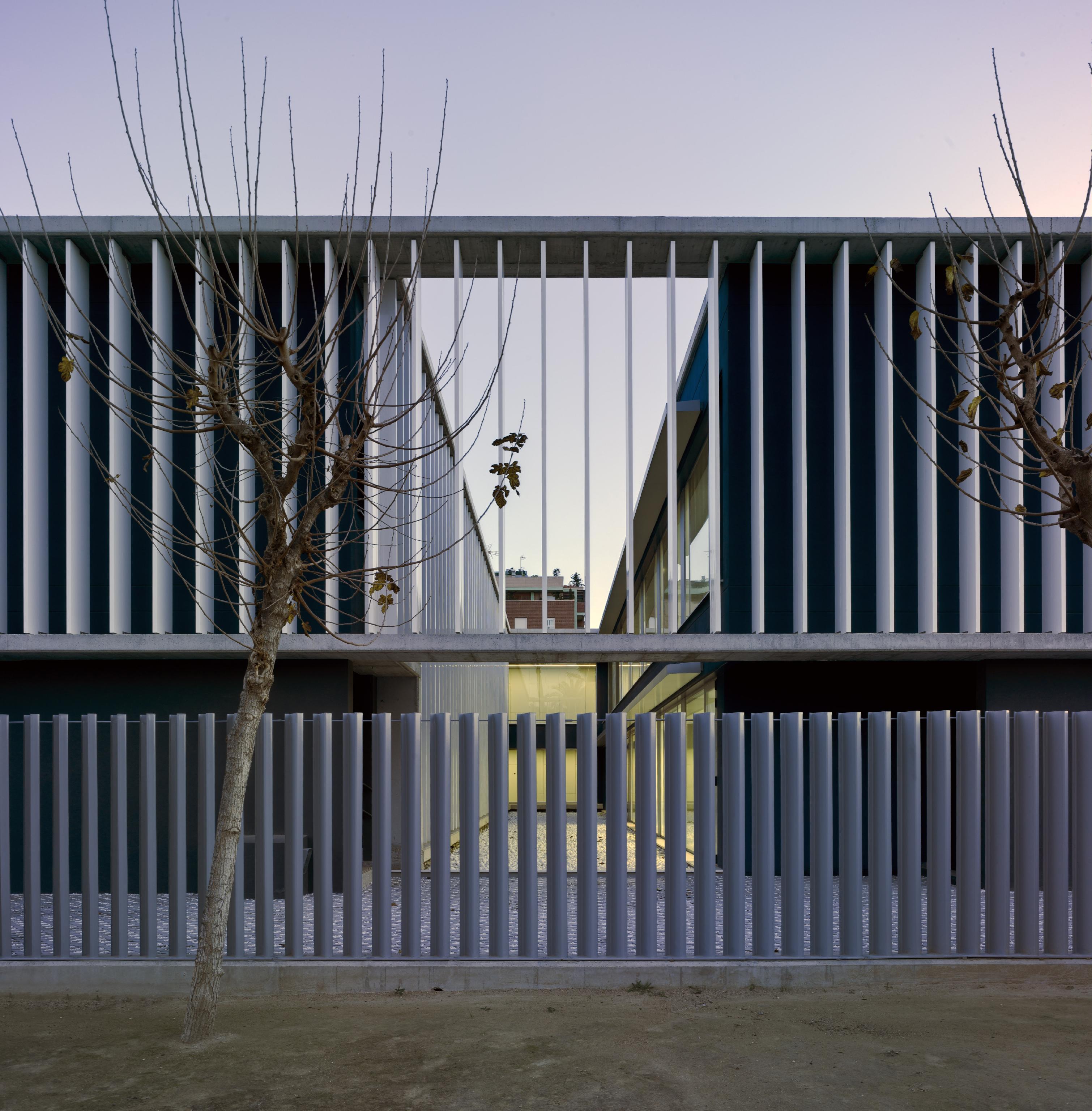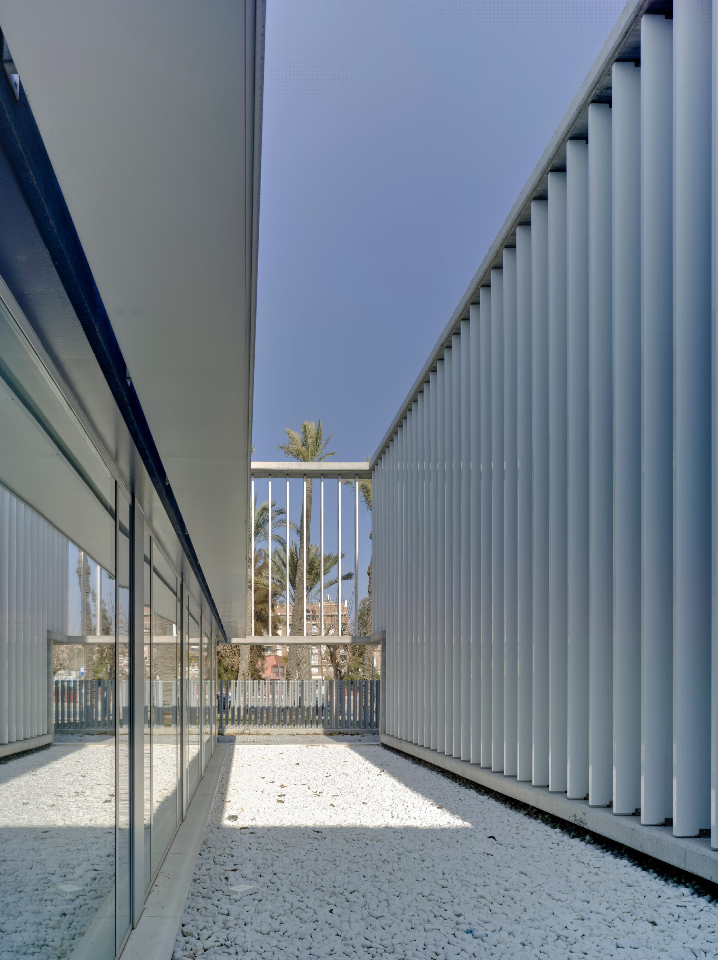Una envolvente de lamas conforma el edificio en todas sus caras. Tan sólo dos gestos interrumpen las lamas, el acceso principal, y el desembarco de las escaleras en los testeros. Un fondo azul, como el cielo que rodea todos los días al edificio, contrasta con el blanco de las lamas.