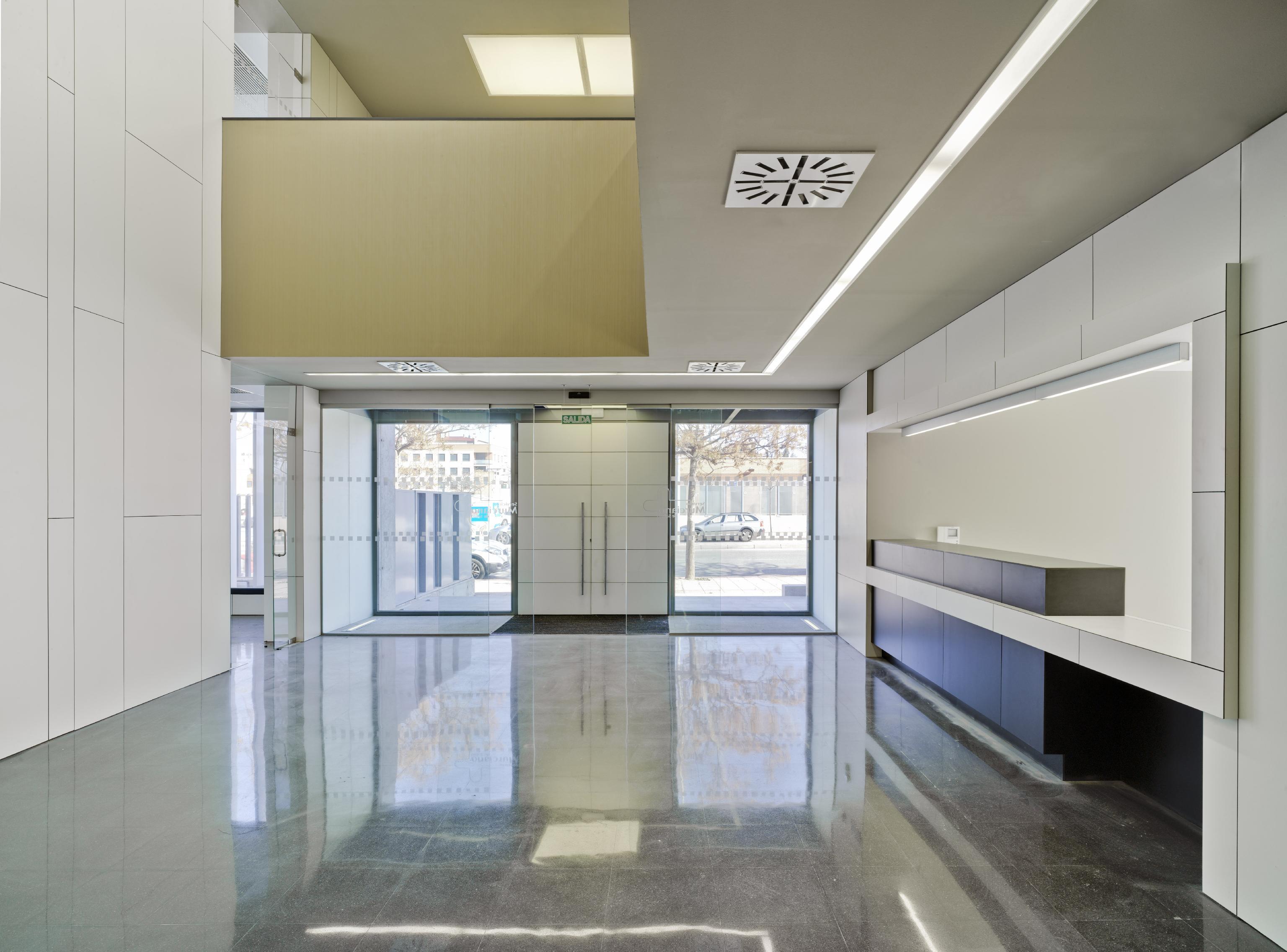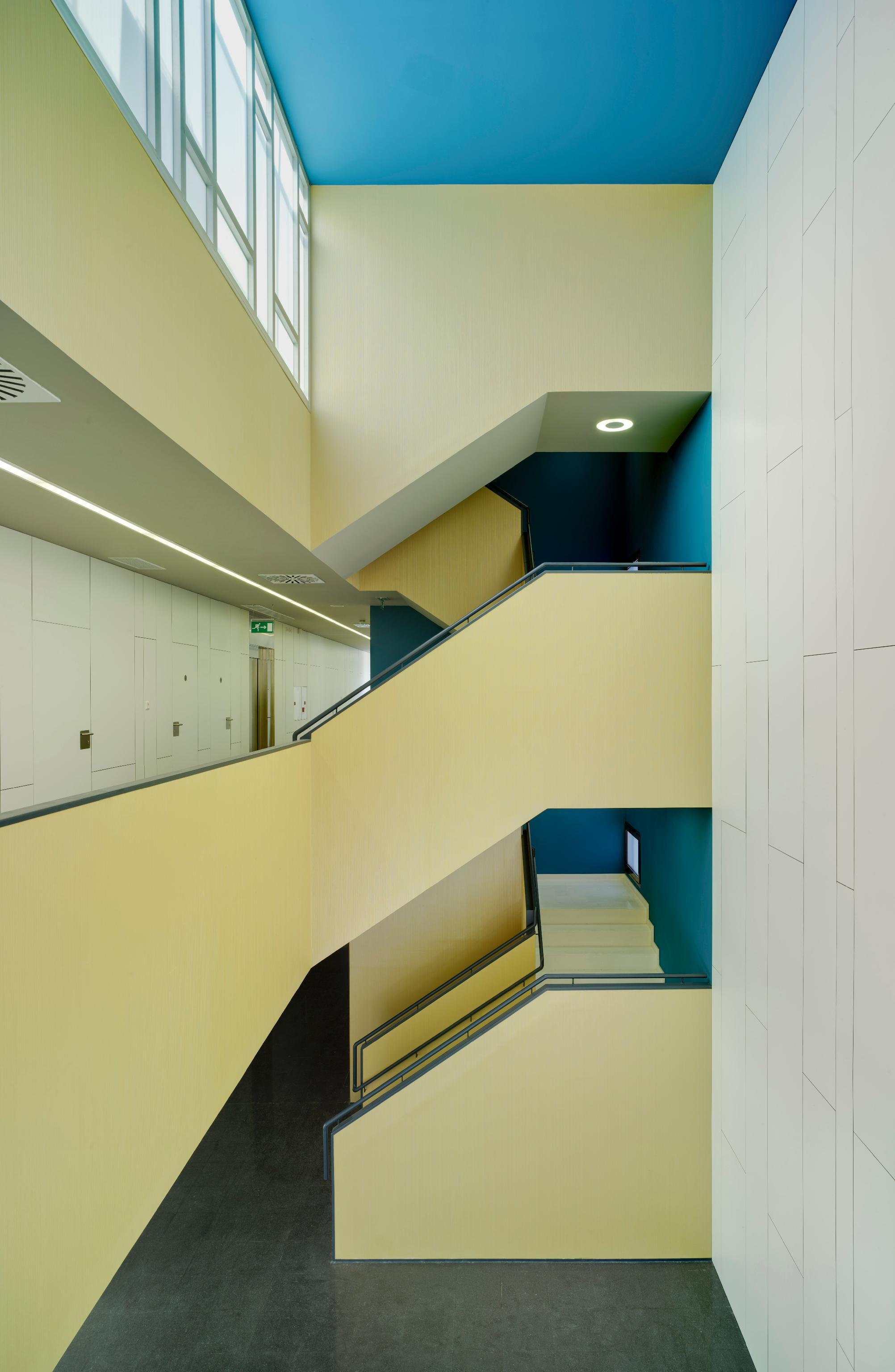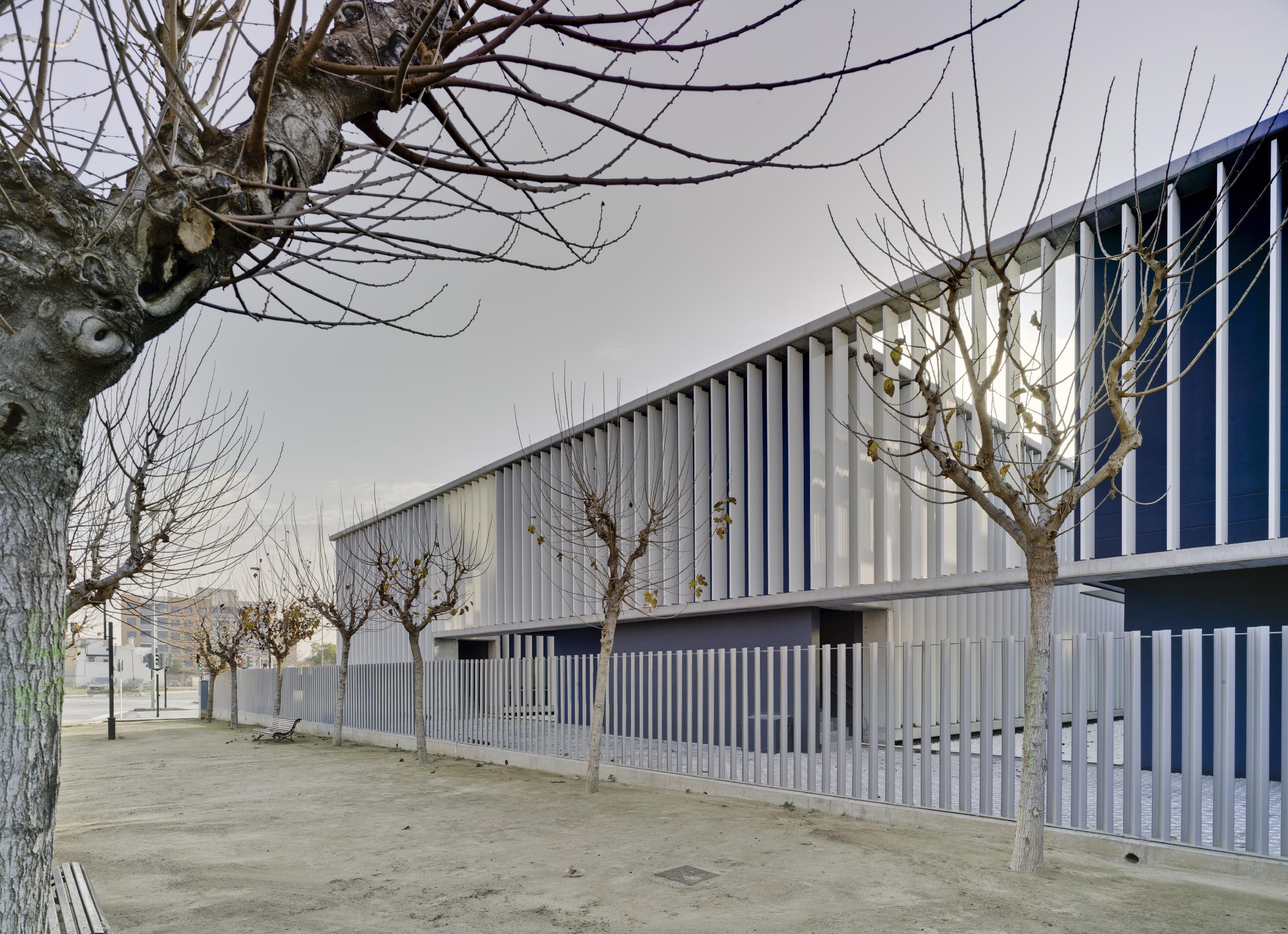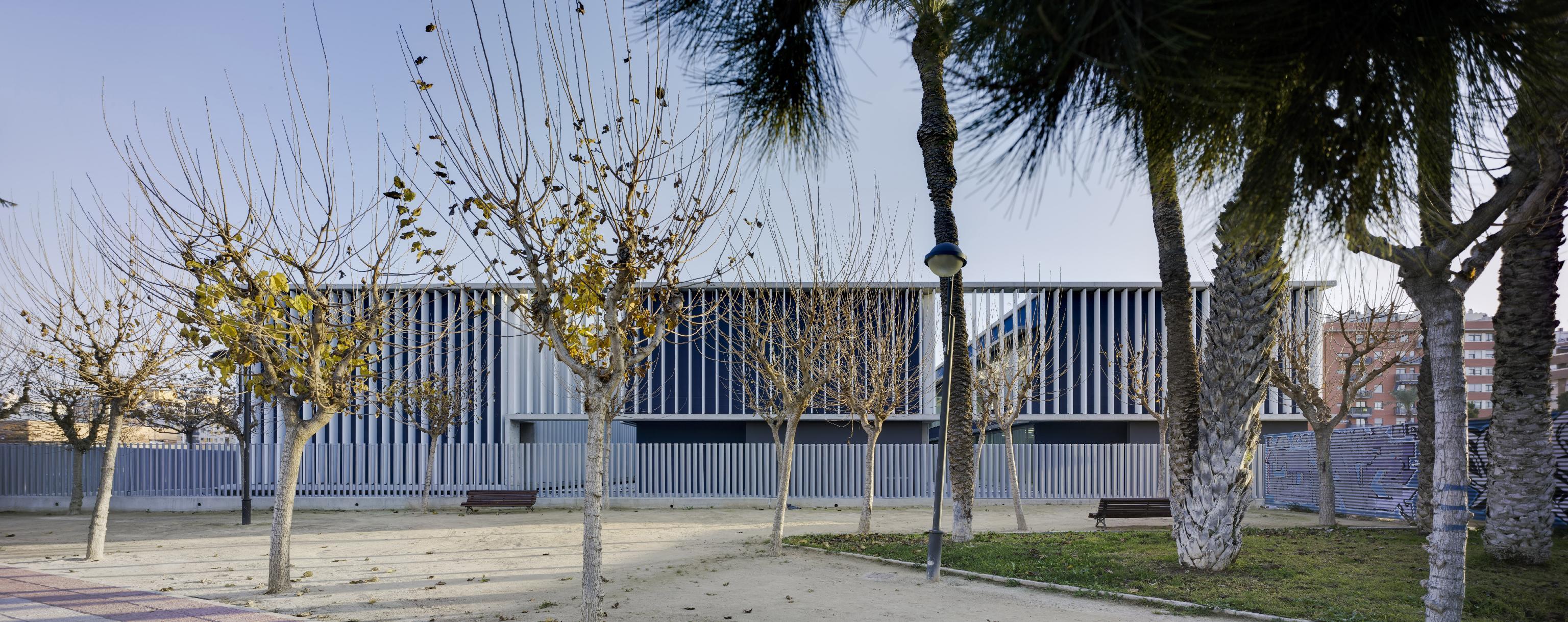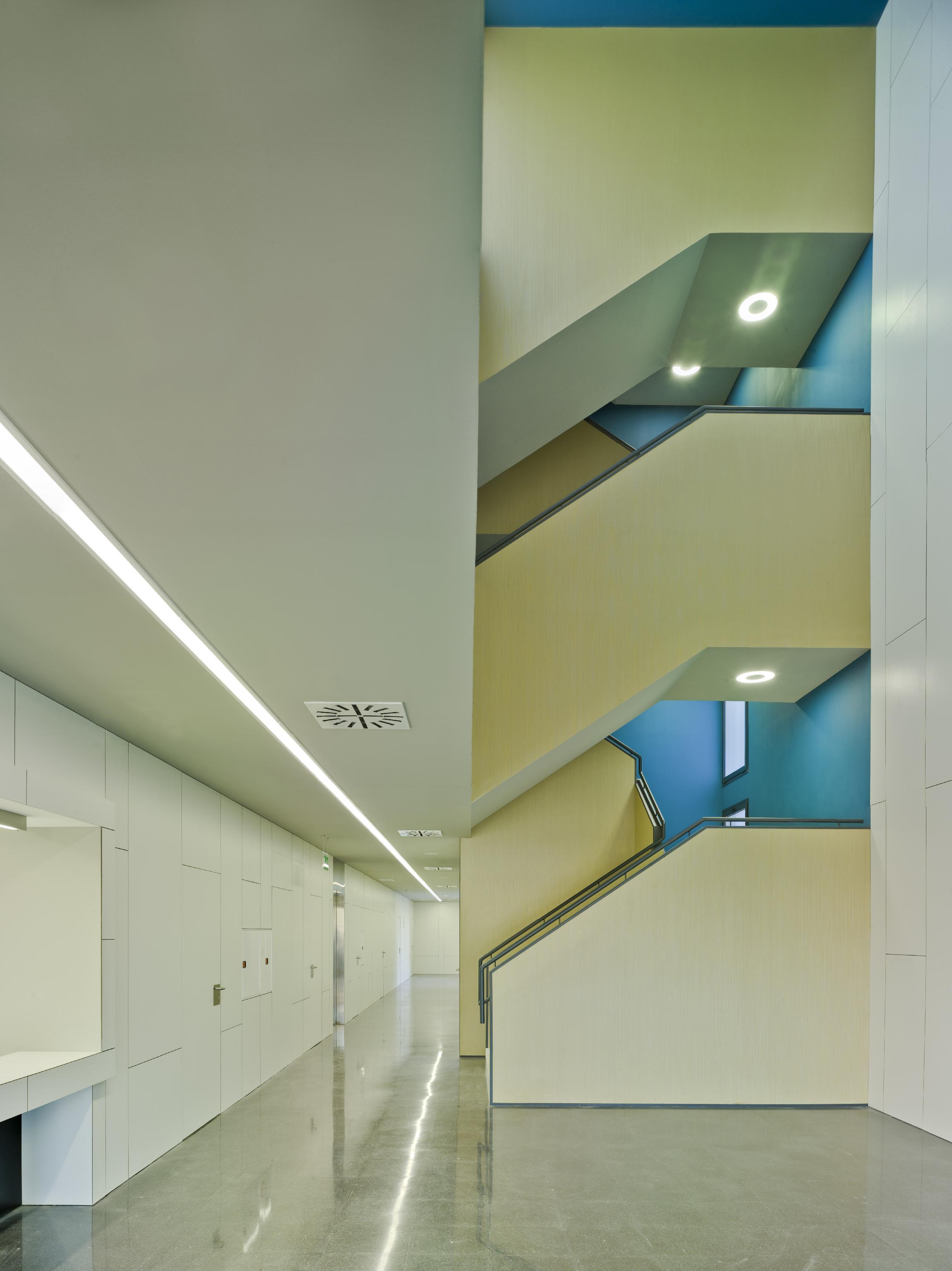 Una envolvente de lamas conforma el edificio en todas sus caras. Tan sólo dos gestos interrumpen las lamas, el acceso principal, y el desembarco de las escaleras en los testeros. Un fondo azul, como el cielo que rodea todos los días al edificio, contrasta con el blanco de las lamas.
