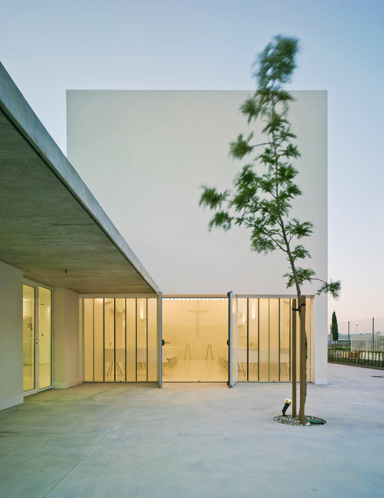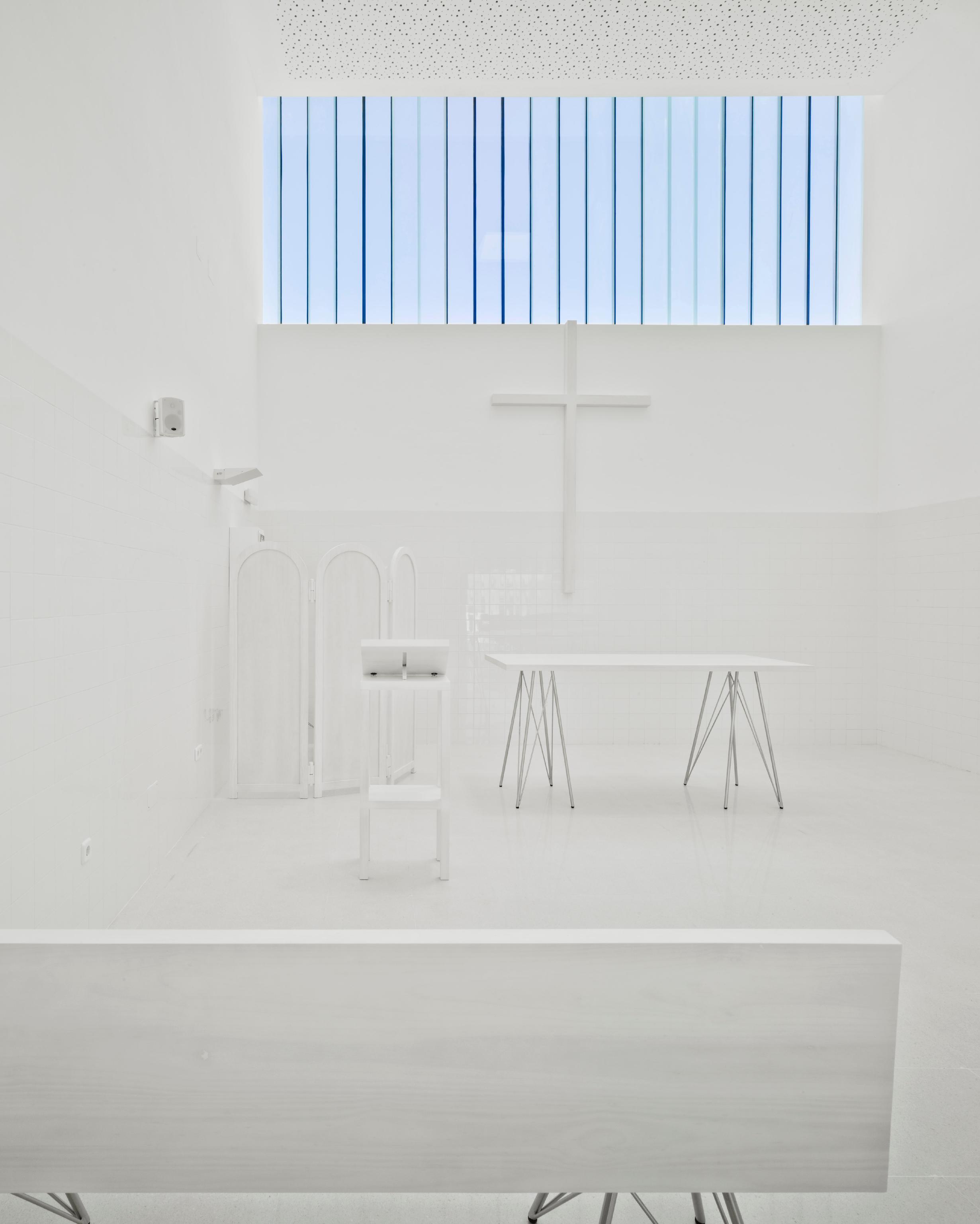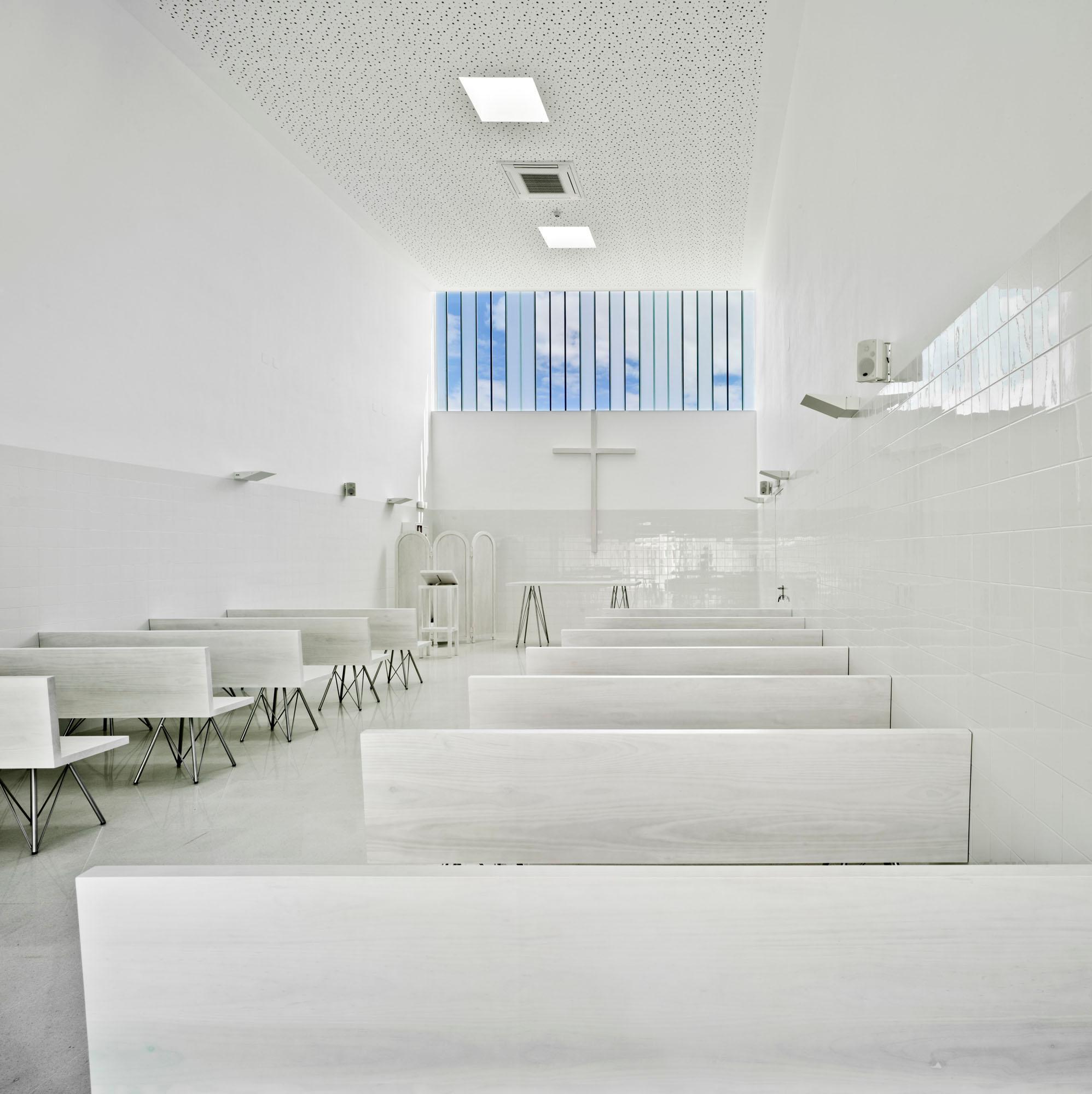 Proyectar y construir todo el mobiliario de la capilla supuso más que una lección un doble desafío: diseñar, además de un banco, el conjunto de piezas que configuran los elementos simbólicos y funcionales de la liturgia (la cruz , el altar, el ambón, etc.), y hacerlo con un único sistema y material: tablón de madera de pino que, en diferentes combinaciones, permite resolver y acoplar todos los componentes de la sala. Cómo reconocer en la distancia el edificio en un entorno de rótulos exóticos constituyó la última lección: apoyamos el letrero sobre el remate del plano de fachada y lo recortamos contra el cielo, sin duda esa era la mejor forma de distinguirlo desde lejos.