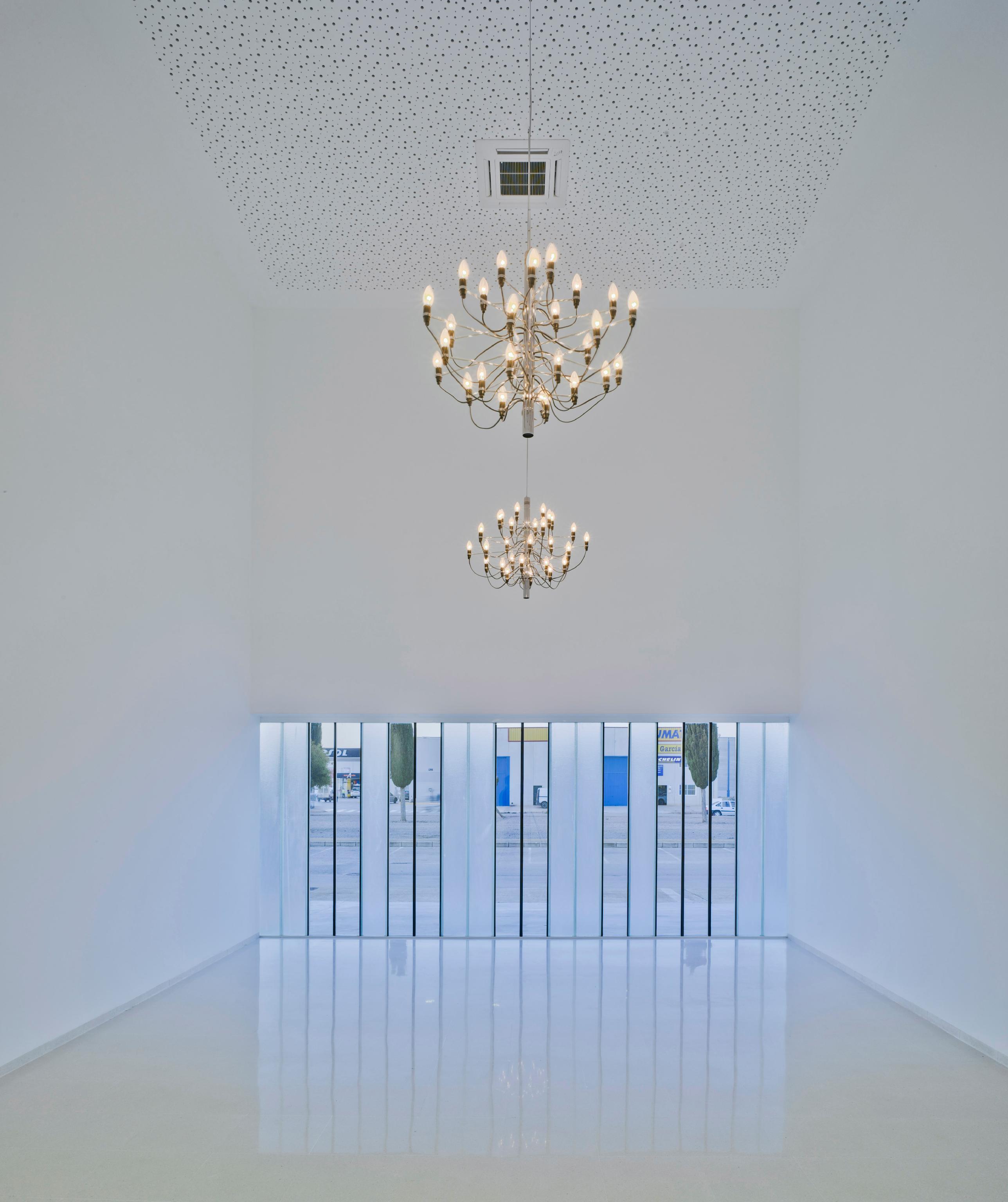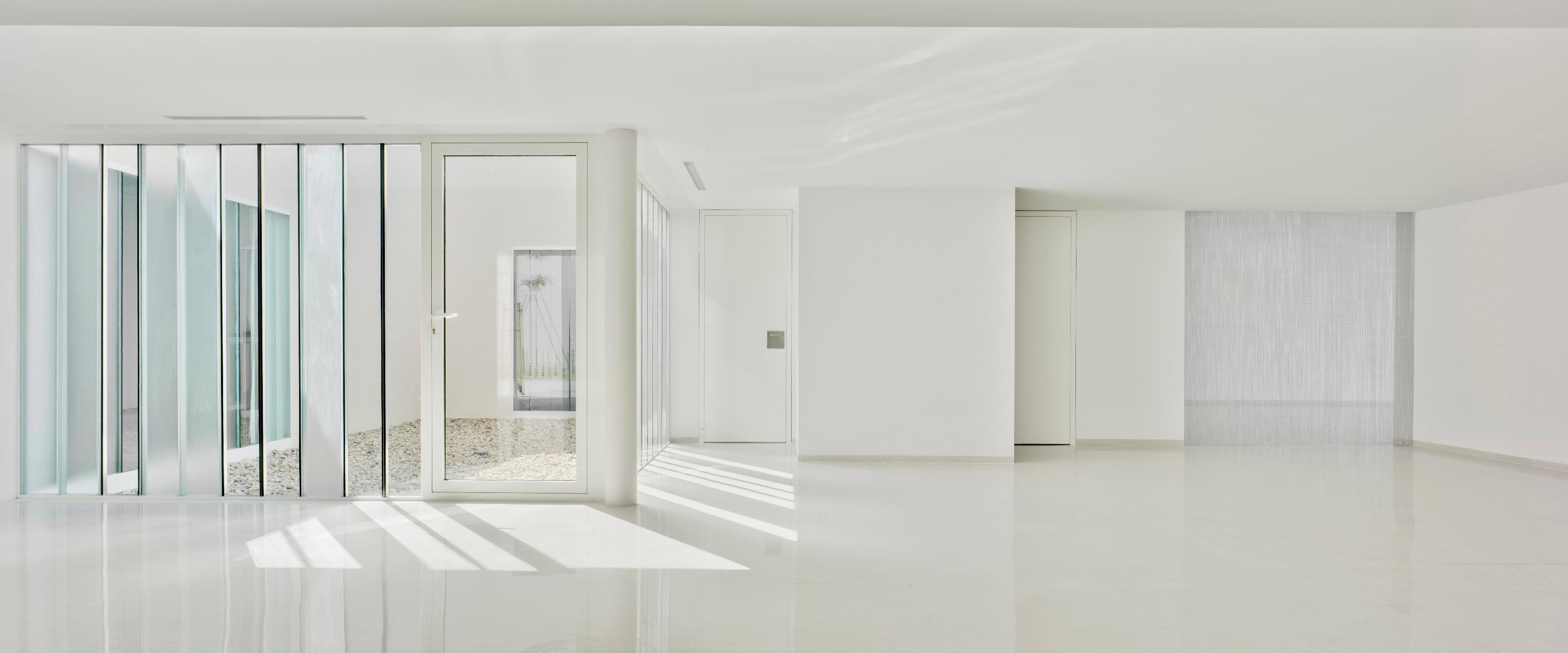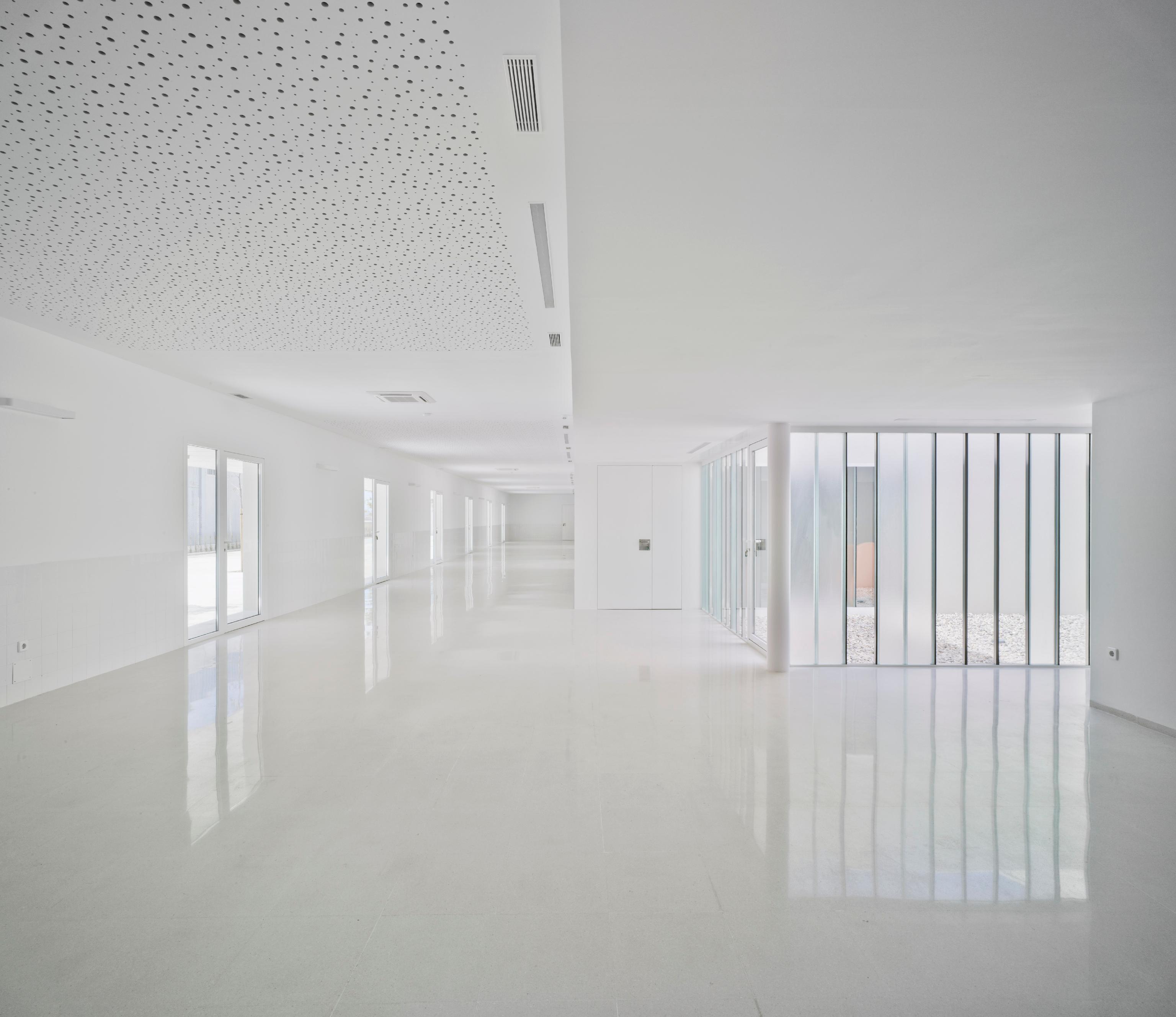 La tercera lección la tenemos aprendida de antemano; apurar al máximo el presupuesto, hasta el límite de la viabilidad. Con ese objetivo se ajustó el esquema funcional del edificio para reducirlo al mínimo, con la consiguiente disminución de superficies y la consecución de una construcción exacta, abstracta y de máxima simplicidad. Interiormente la continuidad que proporciona el color blanco y la luz natural en sus diferentes orientaciones queda matizada por la distinta dimensión y proporción de los sucesivos espacios y las texturas de los materiales que los definen.