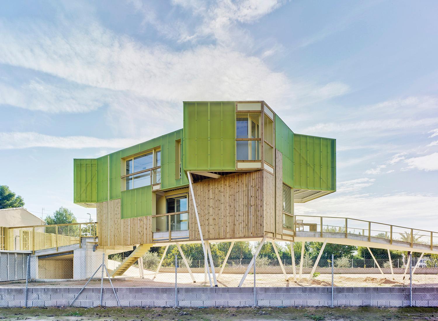 La construcción es degradada verticalmente respecto al impacto en el medio y al orden constructivo. Una losa de hormigón prolonga la acera de la calle sobre pilotes retrasados. Sobre ésta apoya una estructura metálica ligera con distintos vuelos que vacían al máximo las plantas inferiores del solar.
