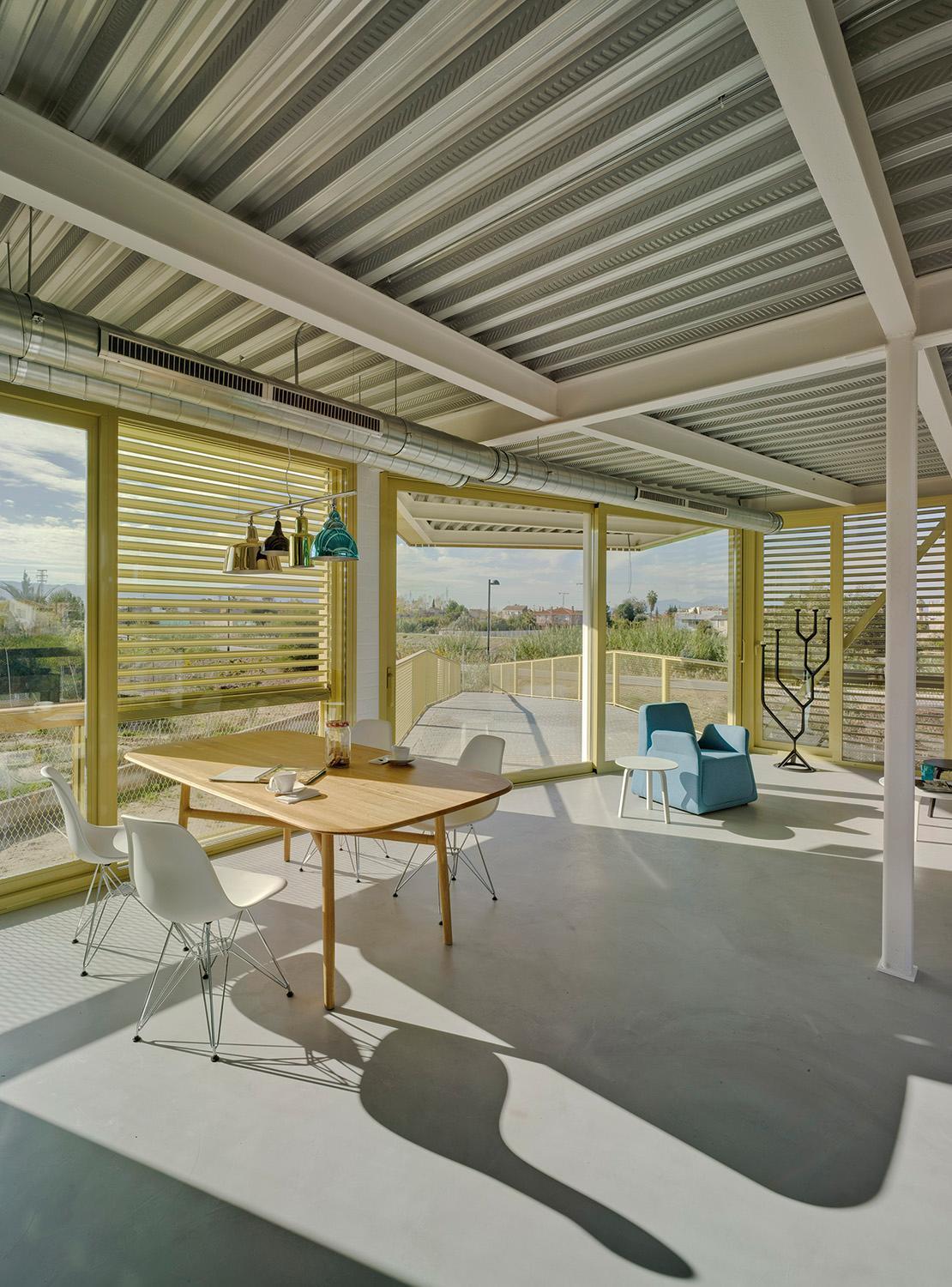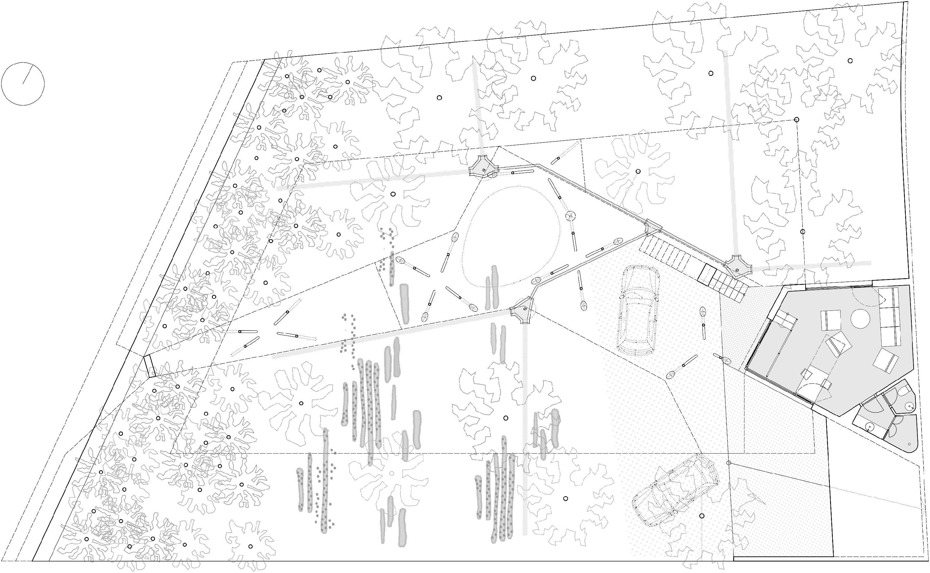 Por último, la jardinería se apoya en una red de canales que nacen en la recogida de lluvia de la vivienda, conectados con el agua de riego de acequia tradicional. Un estudio detallado de especies autóctonas propone un sistema de explotación adecuado a las nuevas condiciones de soleamiento de la parcela, incluyendo un pequeño bosque de ribera Populus Alba que aporta intimidad a la vivienda respecto al paseo del río.
