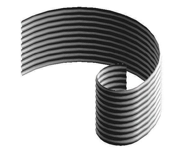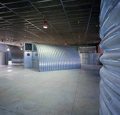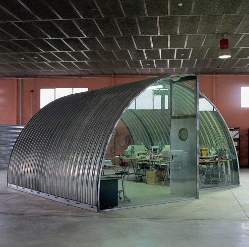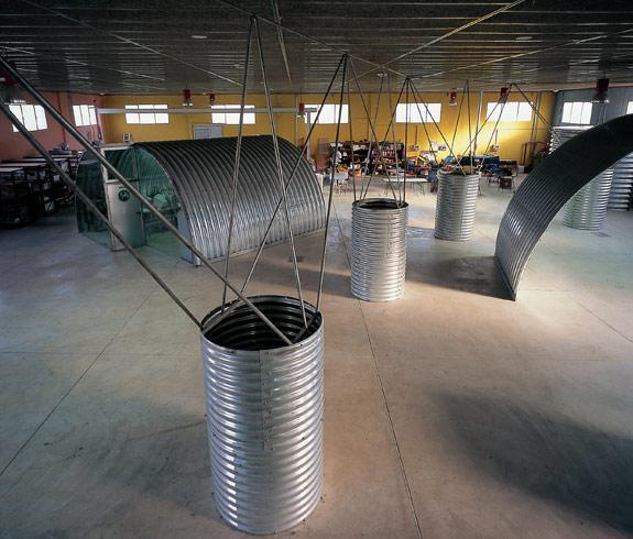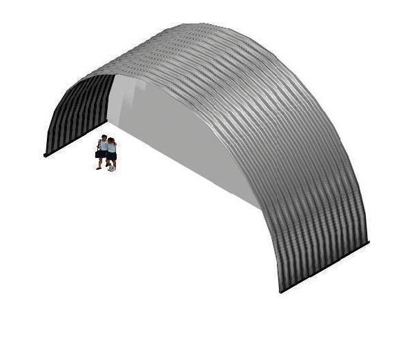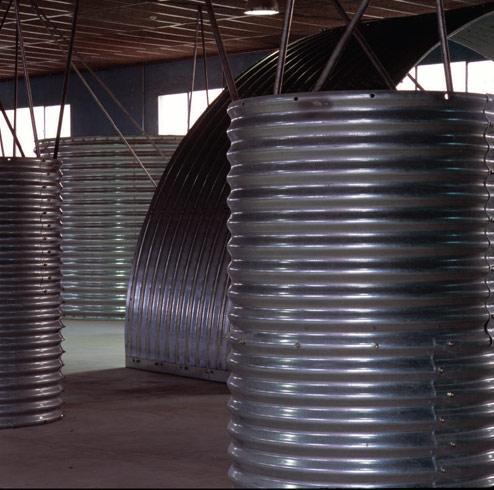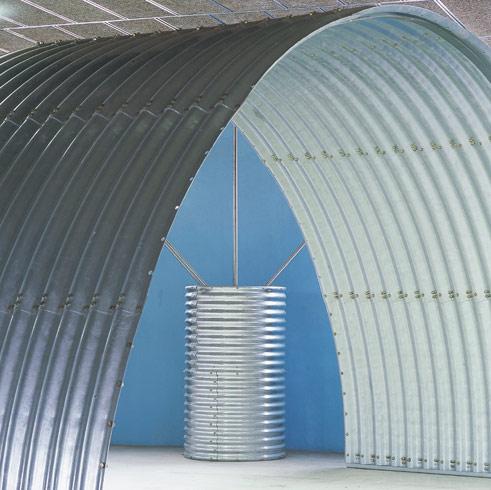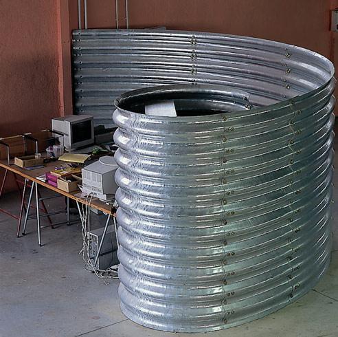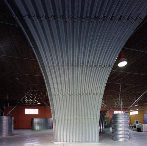 material, las chapas corrugadas curvadas, galvanizadas y atornilladas entre sí,