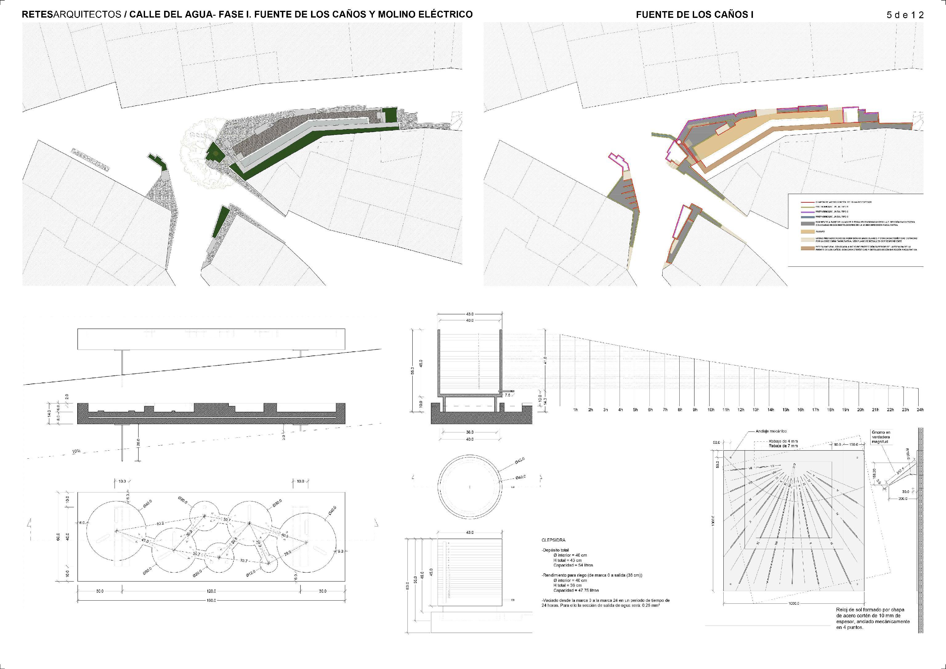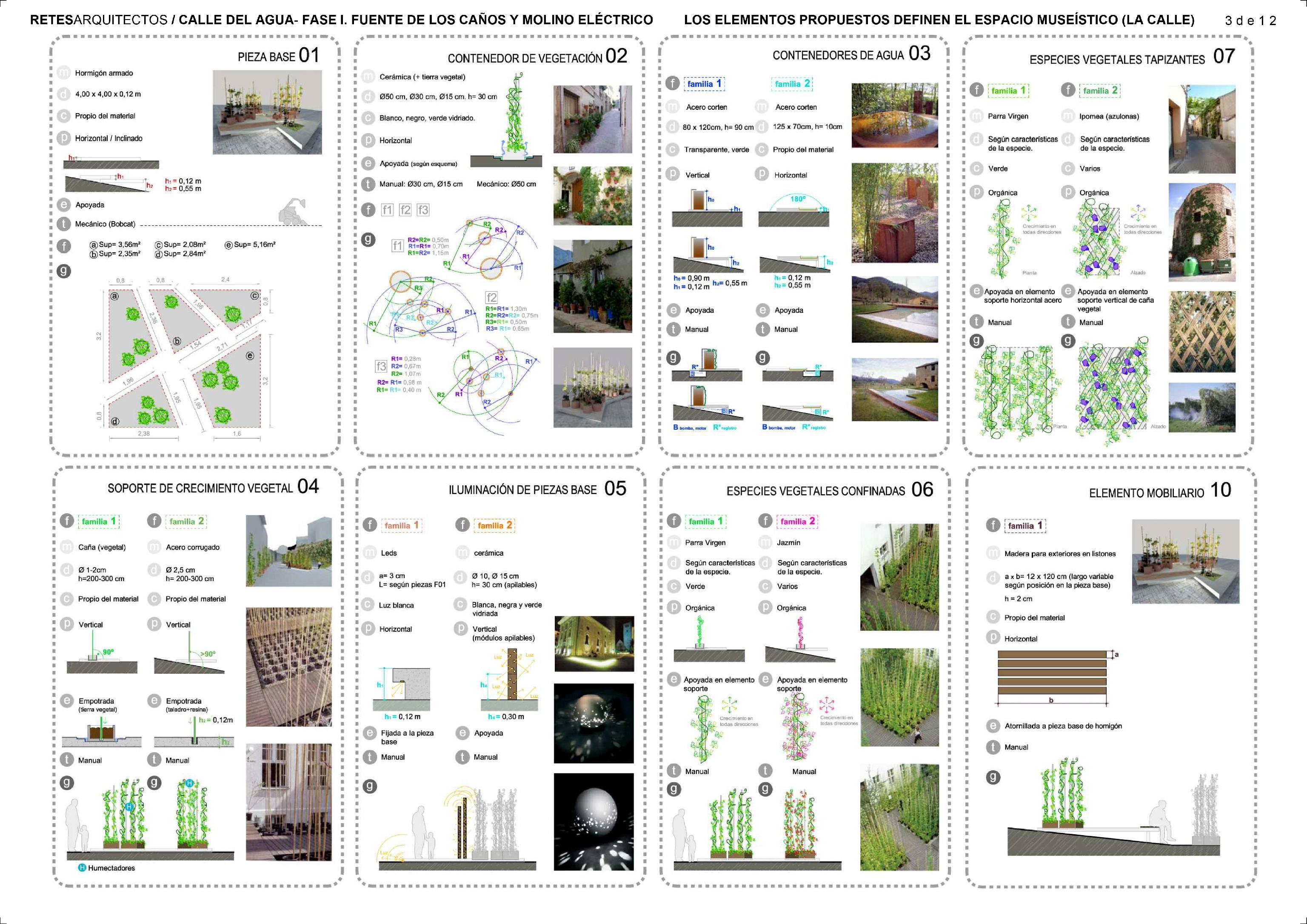 El proyecto va proponiendo otros artefactos que evidencian esta relación: clepsidras, reloj de sol, microgeneradores hidráulicos y solares, pilonas etc. sugiriendo elementos evocadores del agua: difusores. humectadores cerámicos, esculturas dinámicas de agua. La ausencia de agua se sustituye por sus efectos a través de estas relaciones utilizando el verde y el sonido como sus manifestaciones. Al mismo tiempo propone la regeneración del propio espacio y su uso ciudadano mejorando las condiciones de confort con las transformaciones del microclima de la calle, la escenografía del agua y la puesta en valor de los valores etnográficos e históricos. Se estudia el caudal de agua de escorrentía a recoger en La Balsa (próxima fase 2) en toda el área de intervención (calle y cubiertas).