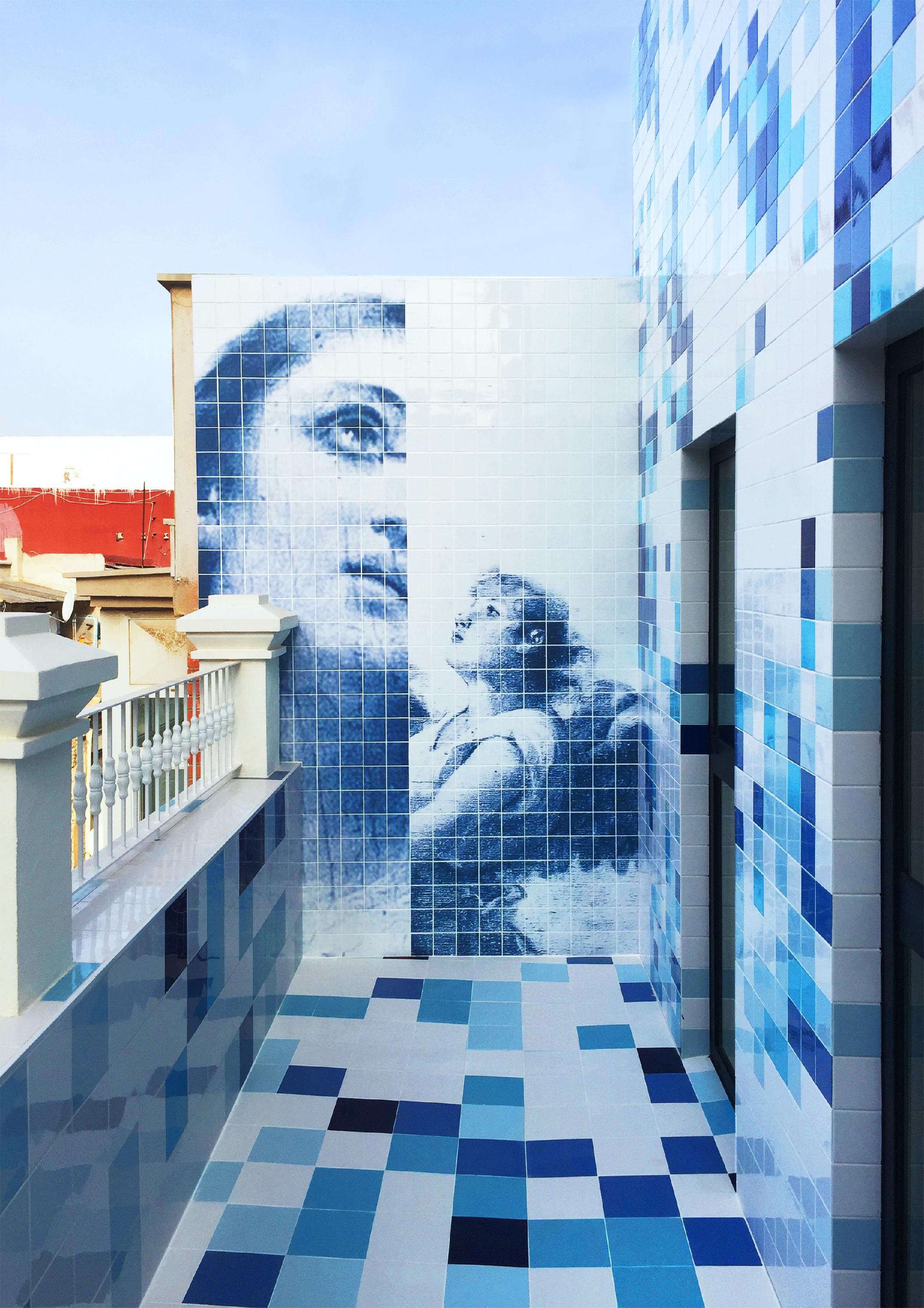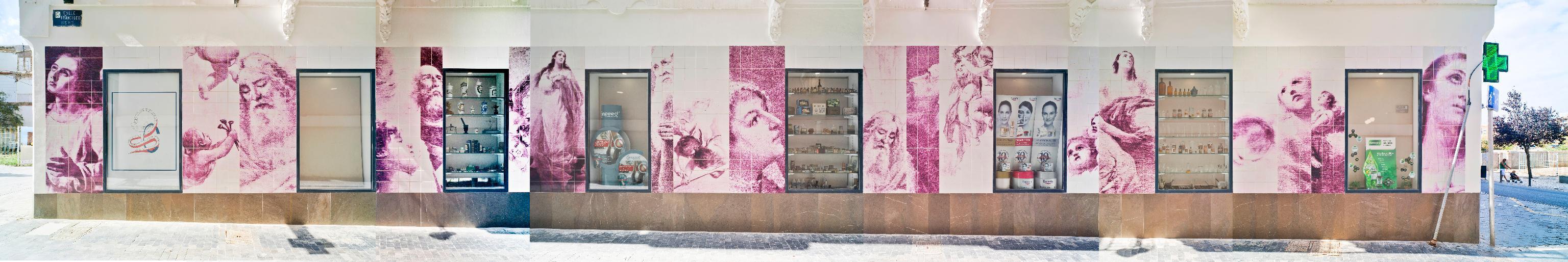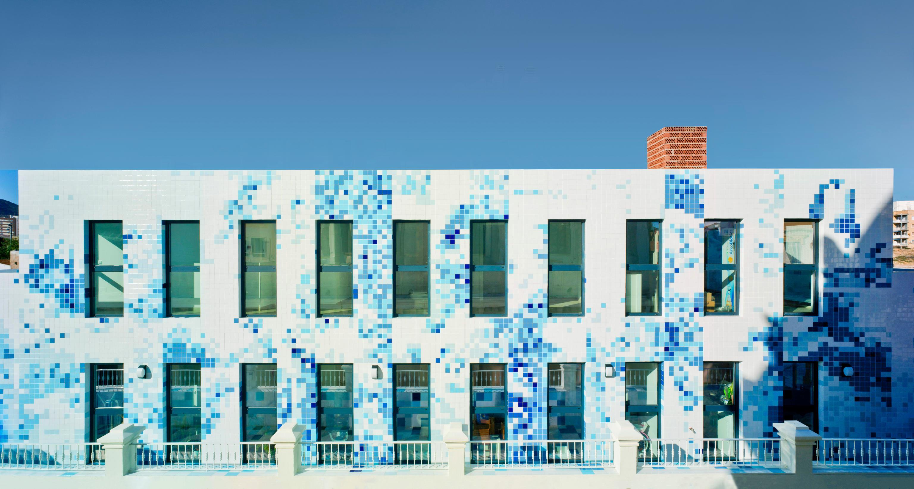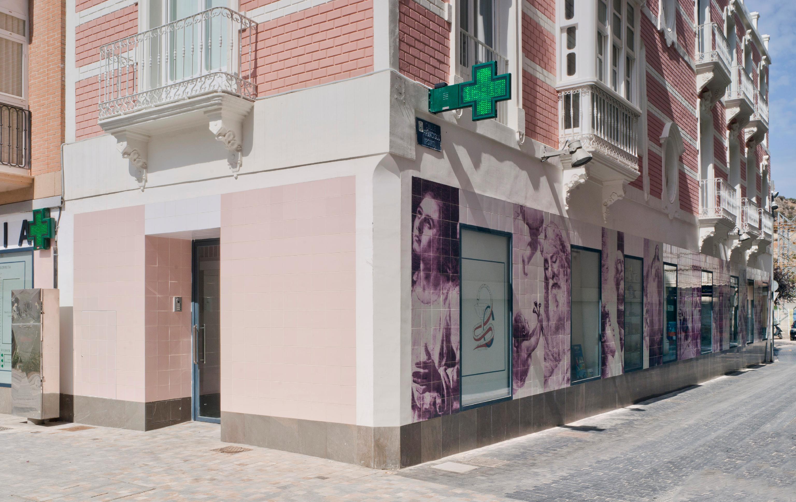 Una composición de azulejo serigrafiado reviste la planta baja a la vez que desarrolla imágenes del interior de la Real Basílica de Nuestra Señora de la Caridad, punto singular junto al que se encuentra, adoptando y reinterpretando la obra del pintor cartagenero Wsell de Guimbarda en estas piezas cerámicas de honda tradición cartagenera.