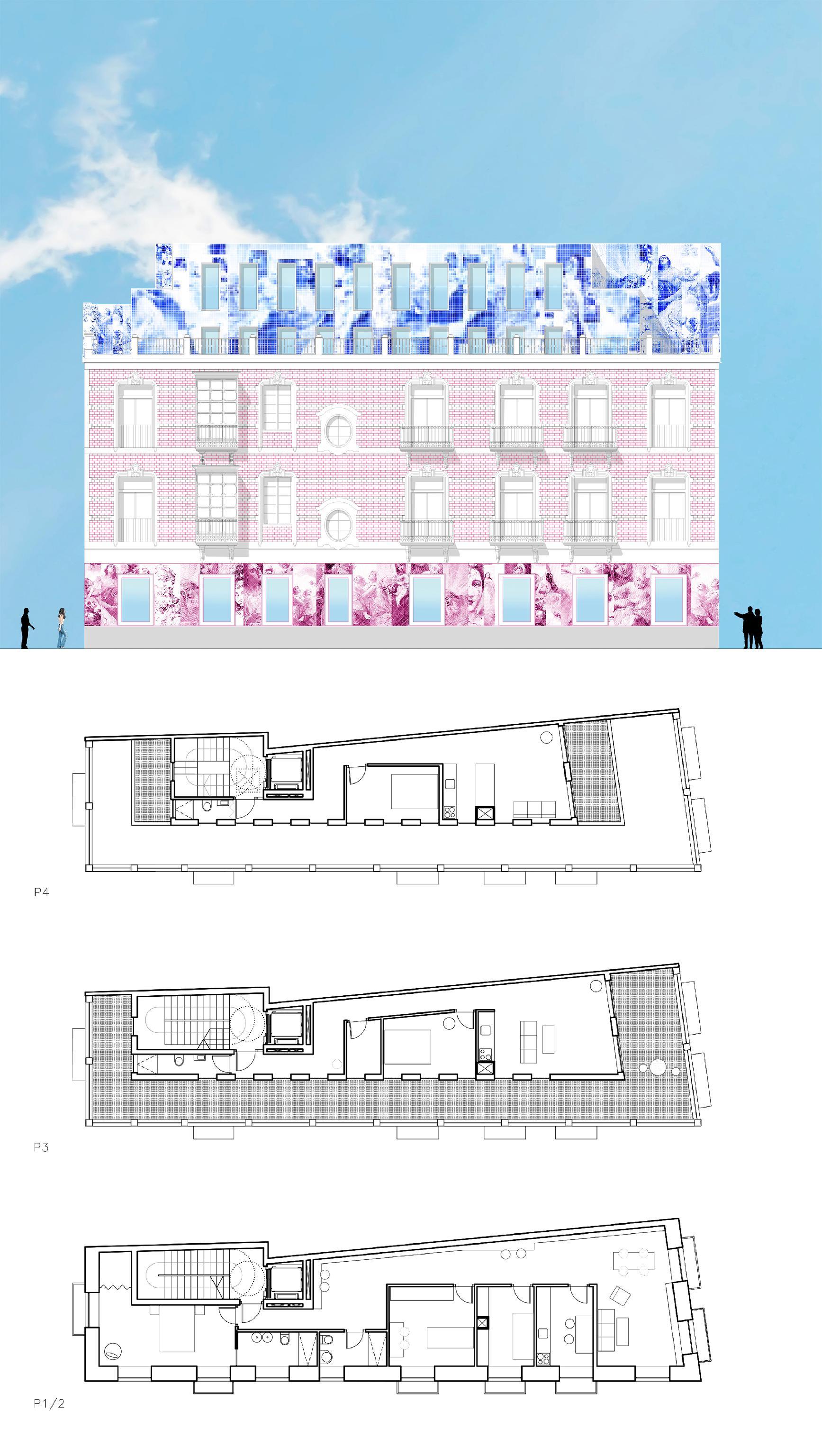 La rehabilitación del edificio, histórico y catalogado como bien a preservar, que se distribuye en un local comercial de planta baja dedicado a oficina de farmacia y dos plantas de vivienda, propone un remonte sobre el mismo de dos plantas de ático y terrazas que configuran una nueva volumetría de conjunto.