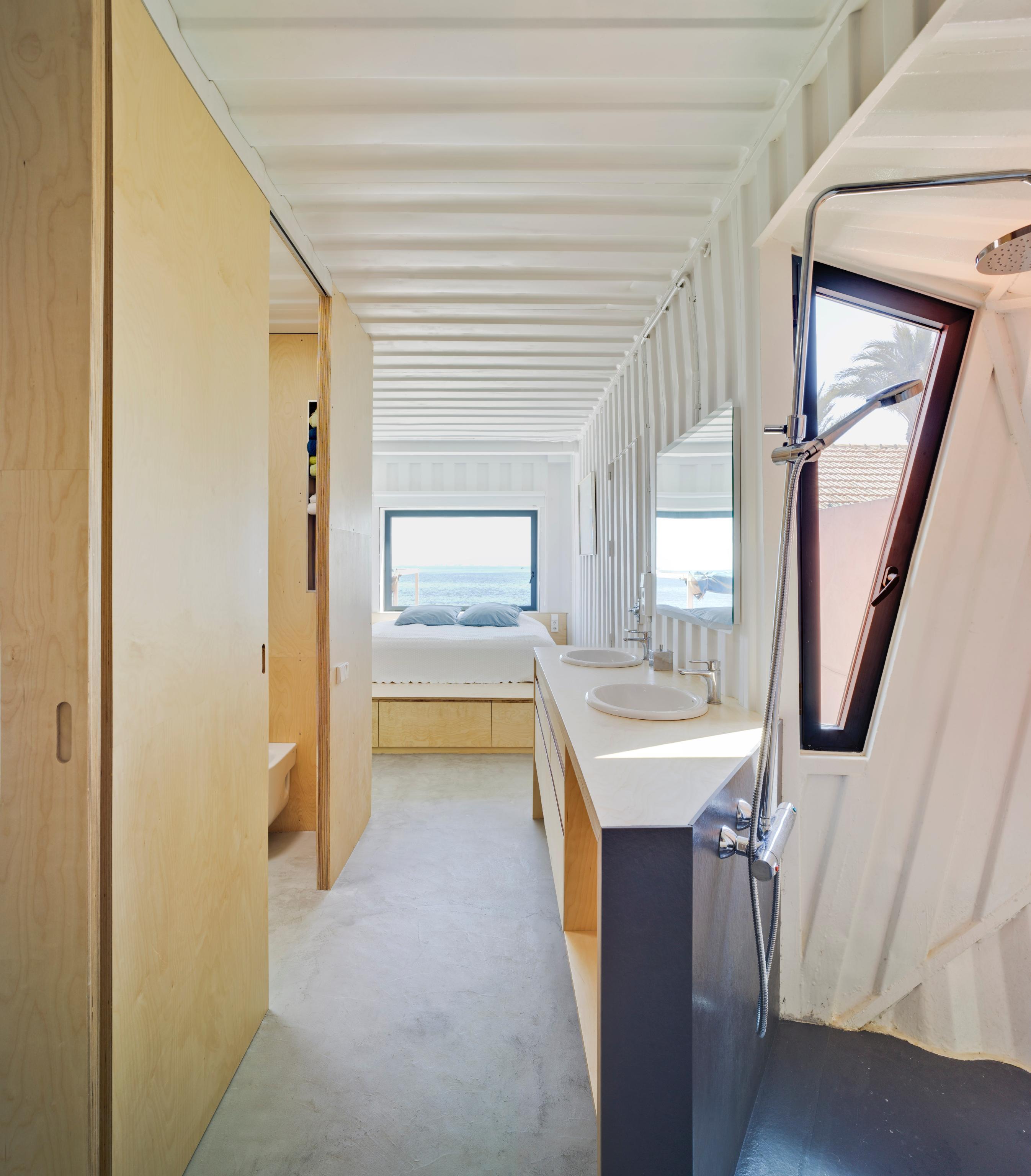 Un contenedor marítimo reutilizado, envuelto en aislante y tela de camión naranja metalizada, sería la solución para satisfacer sus deseos respetando el ajustado presupuesto. Hormigón visto, suelo radiante, chapa metálica aboyada, plásticos como policarbonato o PRFV configuran la expresiva materialidad de esta casa en la que el lujo no radica en unos acabados refinados, sino en la potencia de las vistas, el disfrute de la brisa marina, darse una ducha mirando al mar o dejar entrar la luz a todos los rincones de la vivienda. ¿Qué consideramos como lujo y qué como precario? Sus nuevos habitantes lo tienen muy claro.
