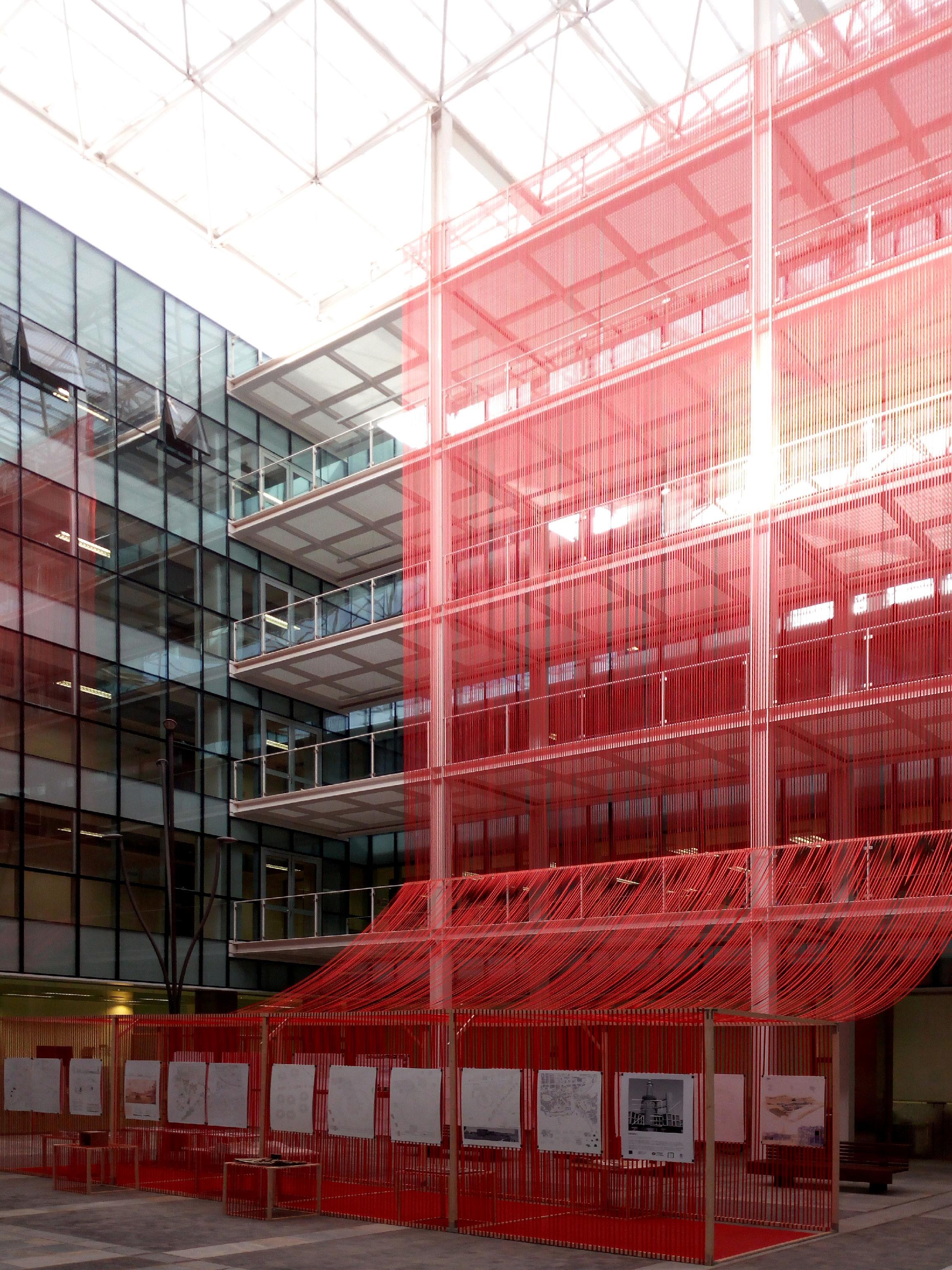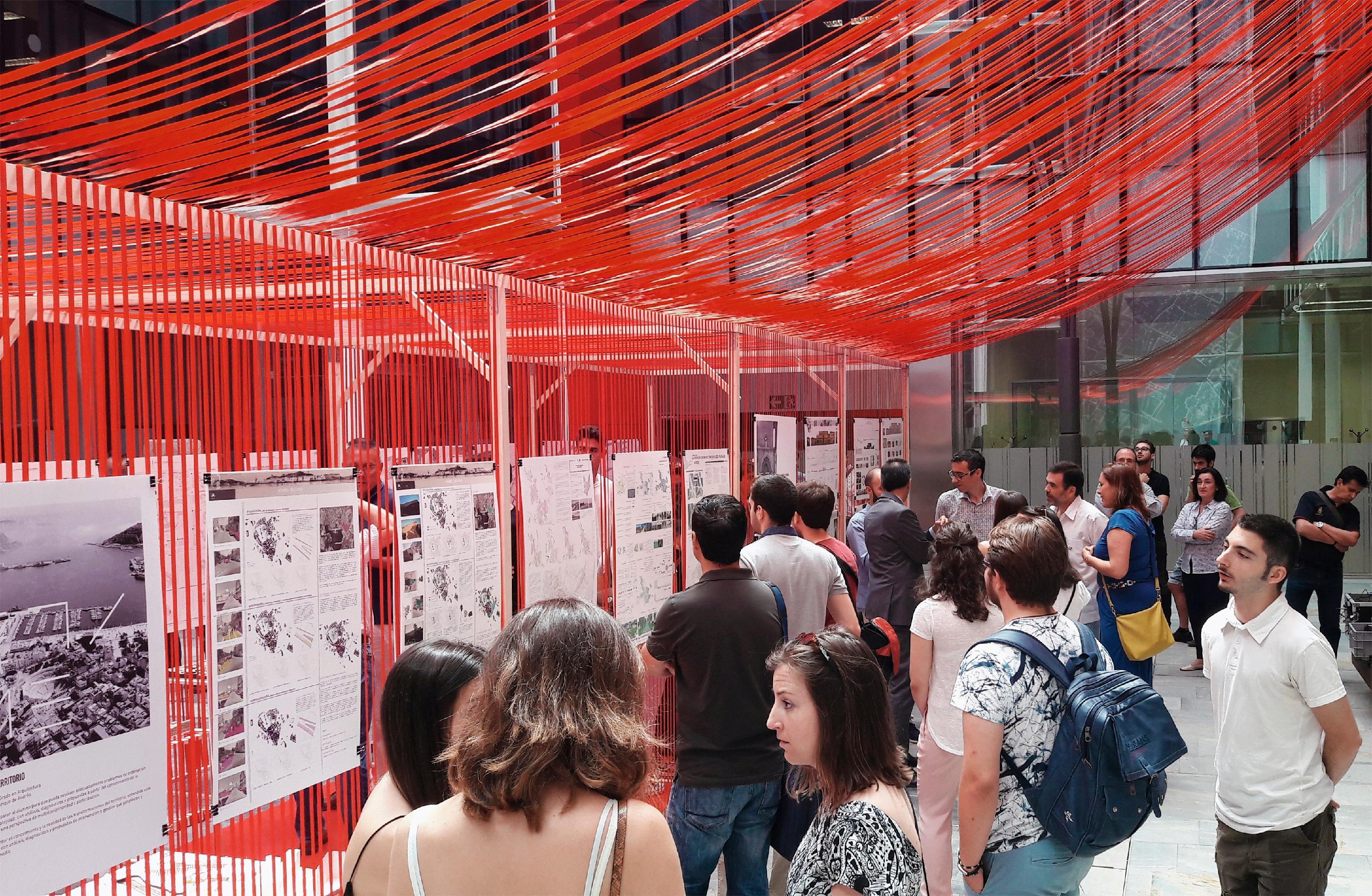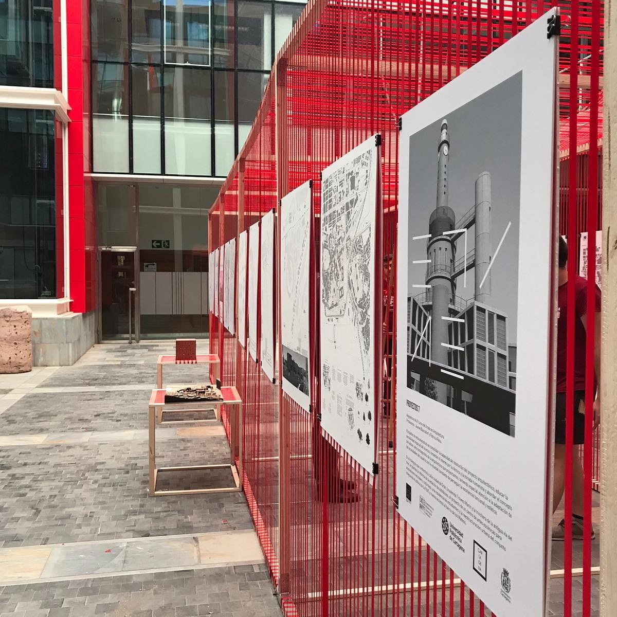 Para afrontar el diseño de este proyecto de arquitectura efímera se buscó invadir verticalmente el espacio del patio, llenando de vida y color un edificio institucional, generando un reclamo de atención a los ciudadanos y trabajadores que acceden al edificio para realizar sus gestiones. Asimismo, se buscaba mantener el espacio expositivo en planta baja y que el recorrido necesario para ver los proyectos expuestos fuese el menor posible, de manera que resultase accesible y rápido a los transeúntes. En cuanto a la elección del color, frente al predominio del metal y cristal, el paramento vertical del ascensor remarcaba el único color cálido del espacio: el rojo #c12506. Este llena de energía y vibración el edificio institucional, de igual manera que las nuevas reflexiones y propuestas de los jóvenes estudiantes de Arquitectura.