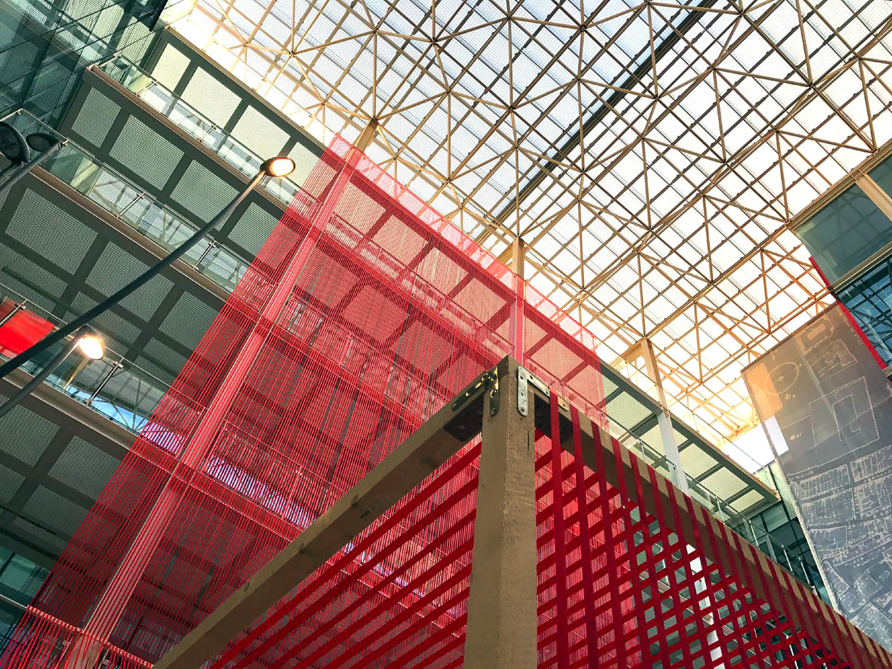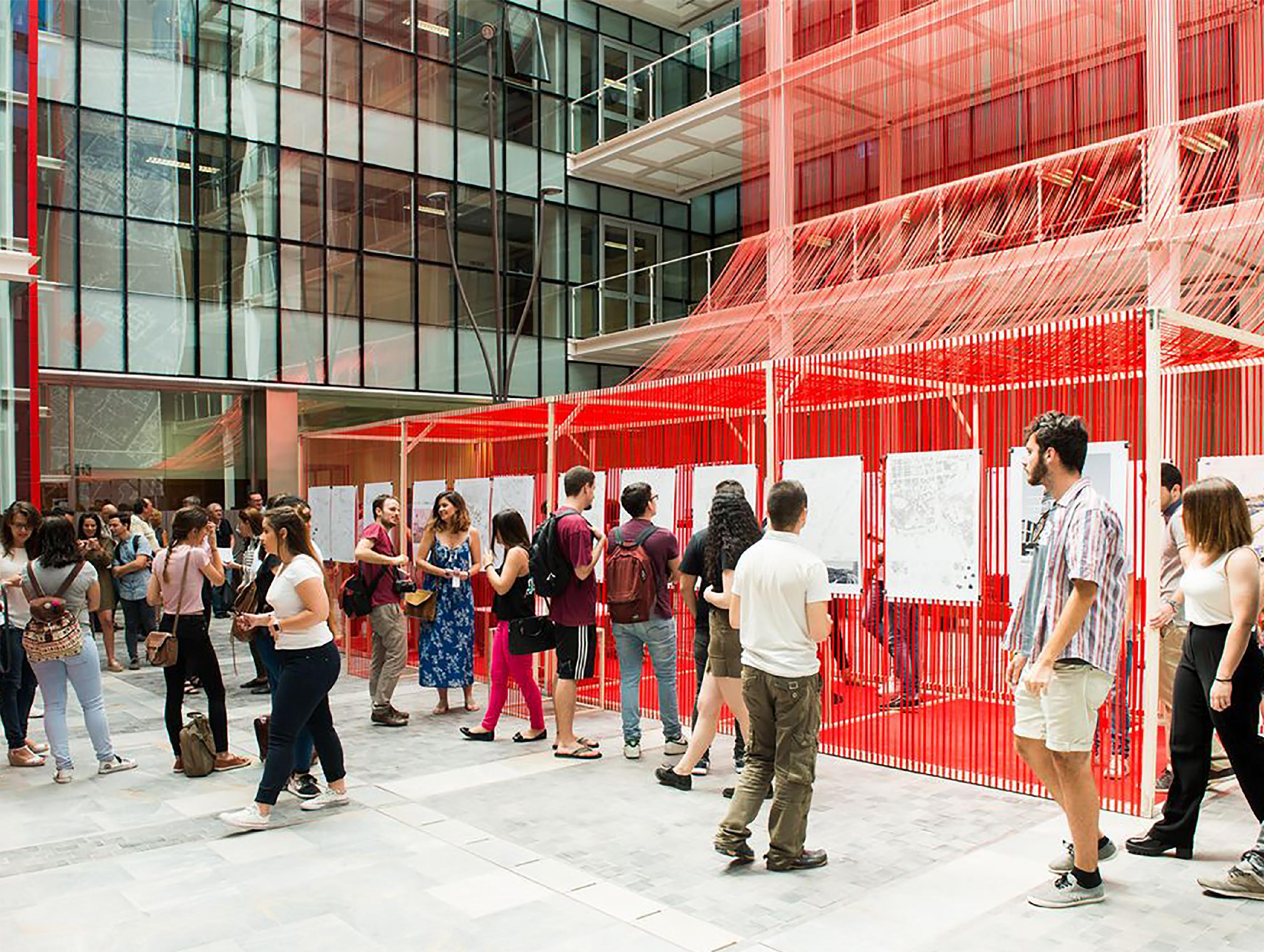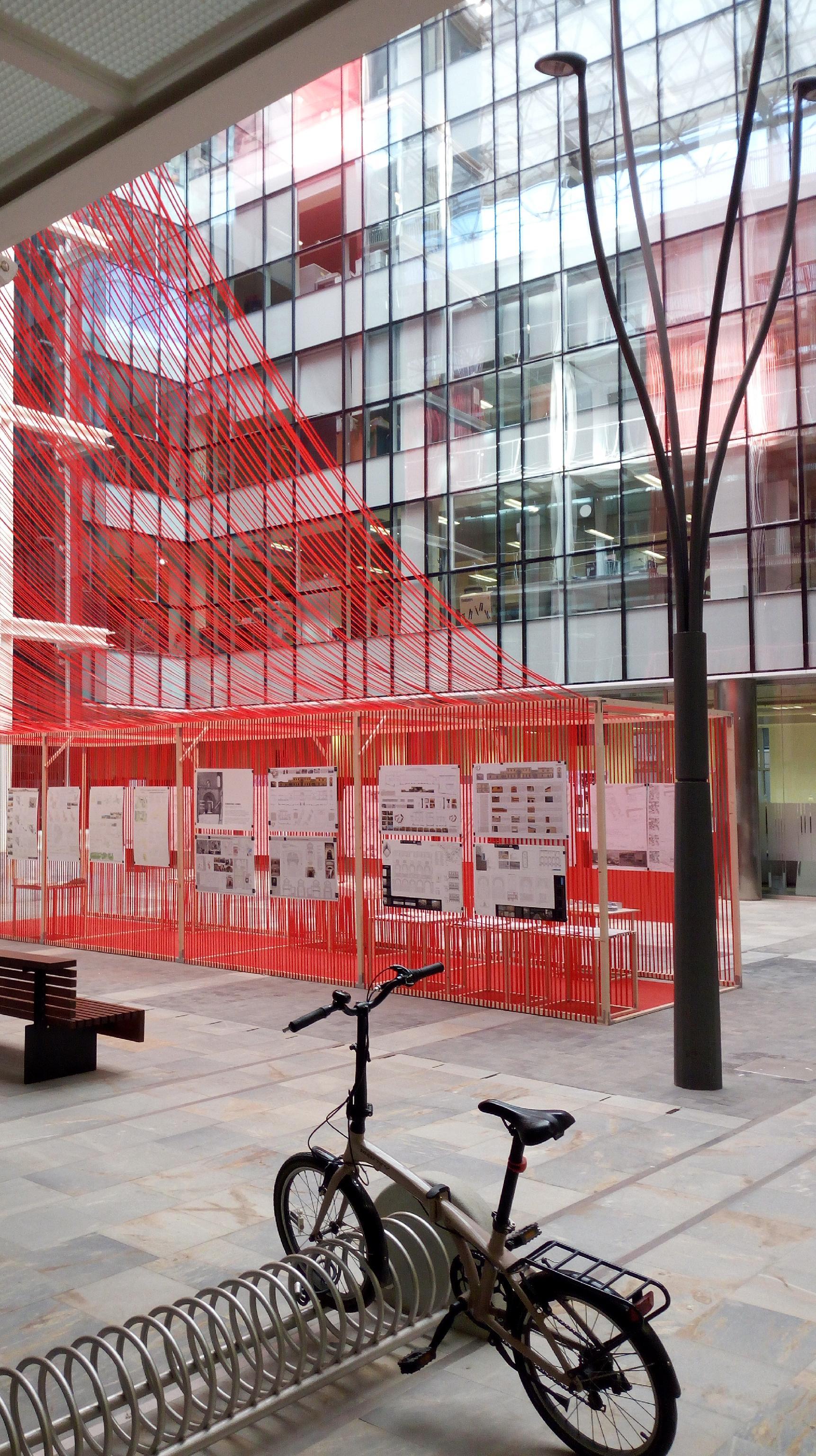 Para afrontar el diseño de este proyecto de arquitectura efímera se buscó invadir verticalmente el espacio del patio, llenando de vida y color un edificio institucional, generando un reclamo de atención a los ciudadanos y trabajadores que acceden al edificio para realizar sus gestiones. Asimismo, se buscaba mantener el espacio expositivo en planta baja y que el recorrido necesario para ver los proyectos expuestos fuese el menor posible, de manera que resultase accesible y rápido a los transeúntes. En cuanto a la elección del color, frente al predominio del metal y cristal, el paramento vertical del ascensor remarcaba el único color cálido del espacio: el rojo #c12506. Este llena de energía y vibración el edificio institucional, de igual manera que las nuevas reflexiones y propuestas de los jóvenes estudiantes de Arquitectura.