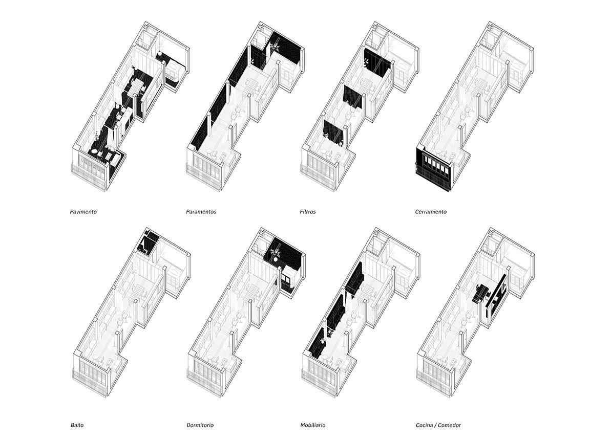 La vivienda existente tenía una organización funcional convencional. A partir de unas dimensiones mínimas, la vivienda se encontraba compartimentada según una estructura clásica: salón comedor, cocina, dormitorio y baño. Su configuración geométrica, con mucho fondo y muy poco frente de fachada, hacía que la mayoría de estancias volcasen a un patio interior de escaso tamaño.