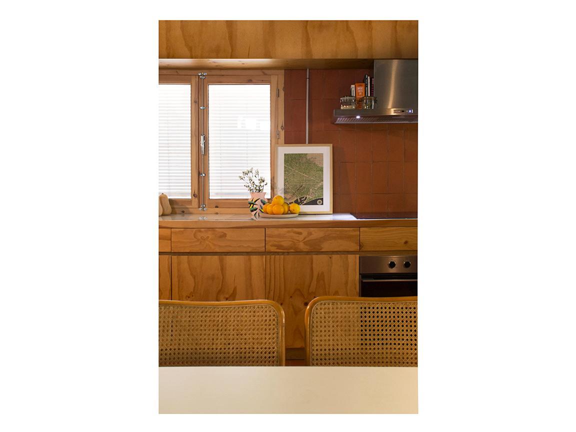 Los muebles se conforman con madera de pino que se combina con tableros de DM natural, sin lacar. El mármol aparece en las superficies horizontales, cualificando el mobiliario, equilibrando, a su vez, las características del diseño entre lo noble y lo austero.