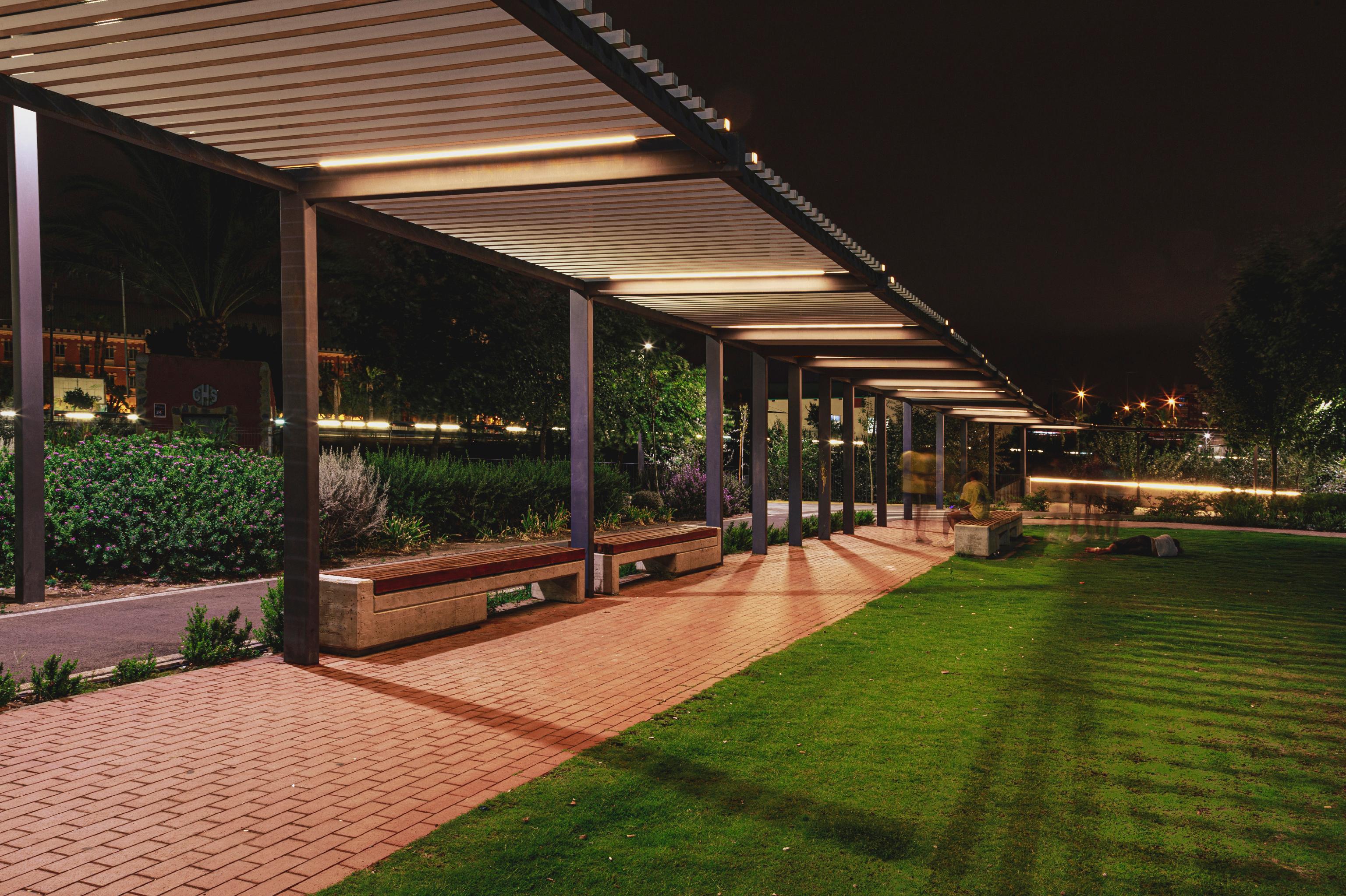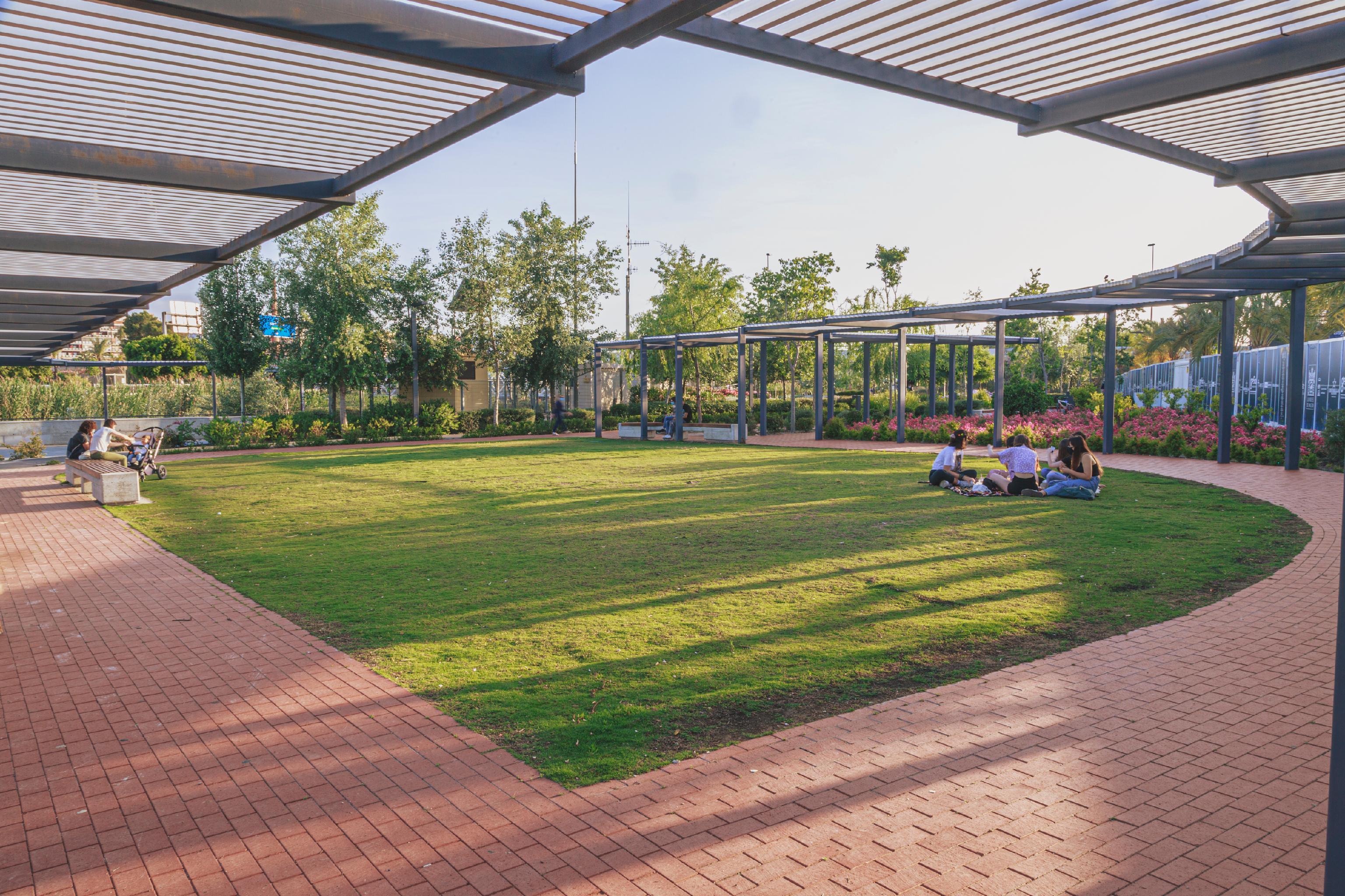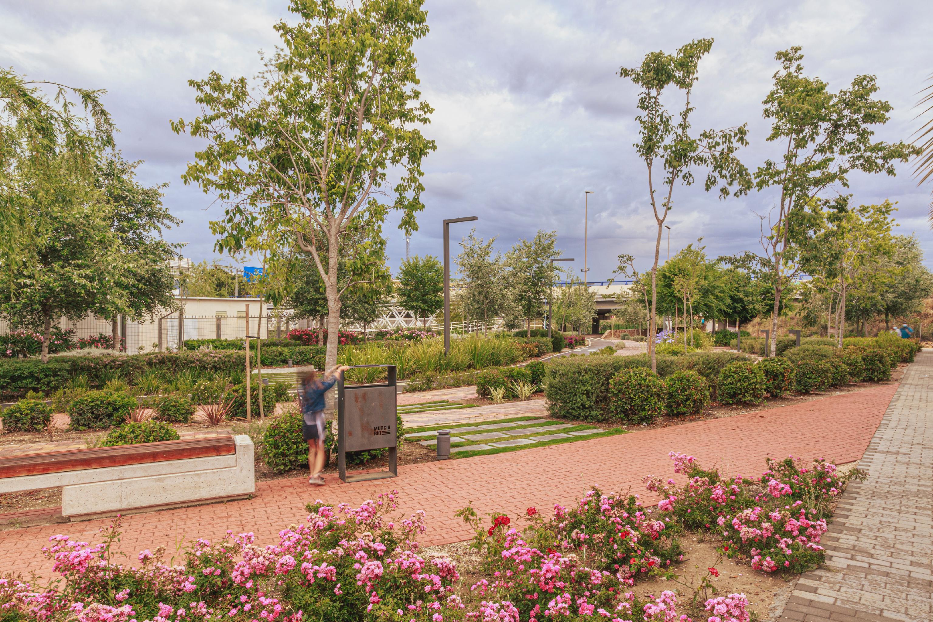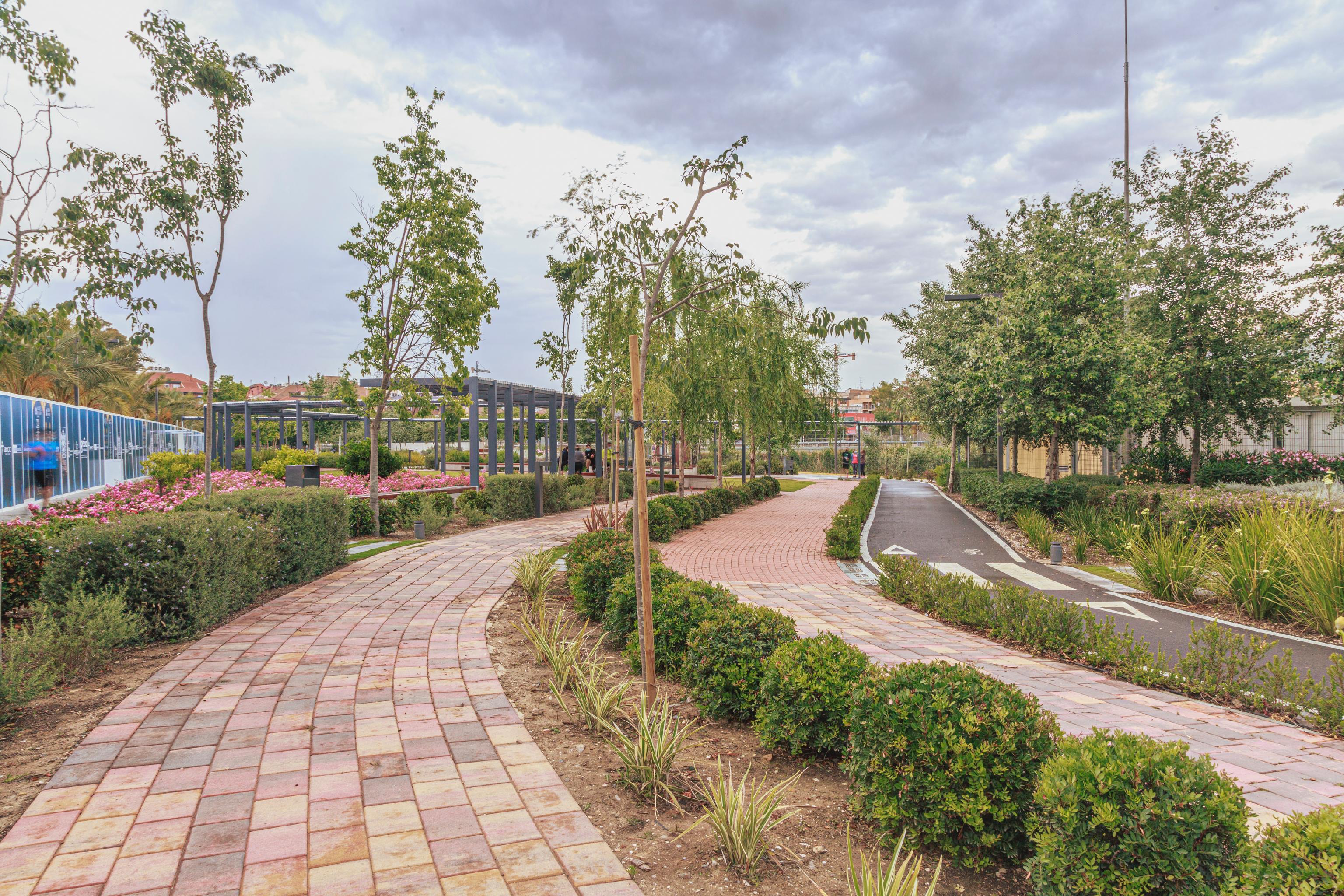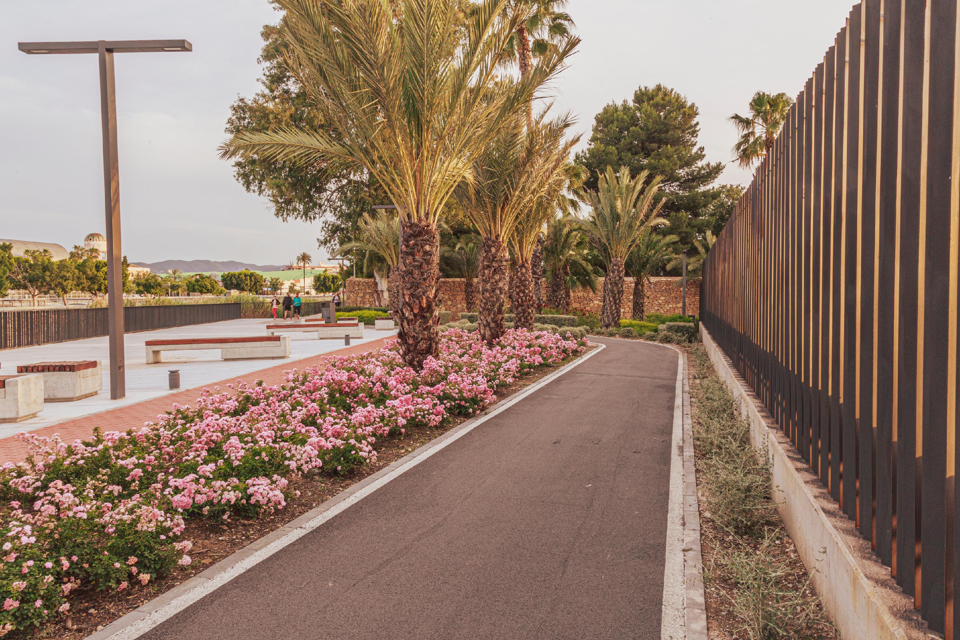 A continuación del paseo volado se entra en una segunda zona ajardinada de mayor sección, no siendo ya necesario volar sobre el cauce. En esta área se plantea un ajardinamiento natural con especies arbóreas de ribera (almeces, fresnos, laurel, robles, olmos, sauces) en las proximidades del cauce, y que van dando paso conforme nos alejamos del mismo a otras especies de tipo mediterráneo y de huerta, creándose parterres a base de frutales (limoneros, naranjos, caquis, nísperos, higueras, moreras olivos, granados) y una hilera de palmeras que marca visualmente el límite del proyecto. Entre toda esta superficie vegetal discurren los itinerarios peatonales y ciclados, ubicándose en el área central del parque con un espacio abierto rodeado por una pérgola y que supone el punto de reunión y de actividades principal de esta zona.