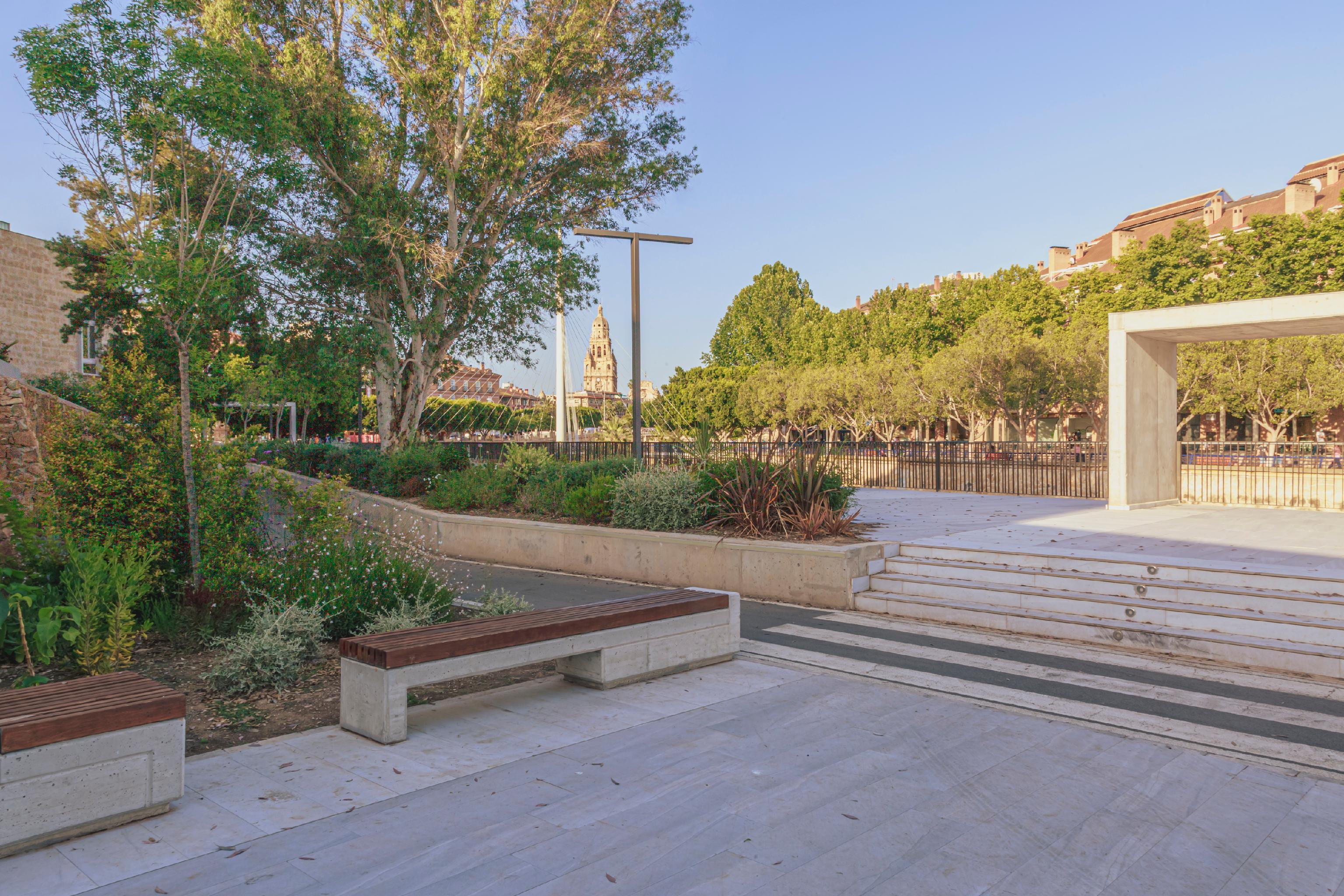En el inicio del itinerario se proyecta un pórtico de acceso que marca la entrada al paseo fluvial. En la primera parte, más urbana y que está constituida por el voladizo lineal asomado al río, se segregan las circulaciones peatonal y ciclista. La separación entre estos dos ámbitos, rodado y peatonal, se hace efectivo por un pequeño desnivel que arranca en el inicio del paseo y que va disminuyendo hasta llegar a desaparecer en la zona final de este itinerario, y además se prevé una hilera arbolada de porte con especies como álamos, almeces u olmos, acompañada de un estrato bajo de plantas arbustivas y ornamentales de carácter mediterráneo (laurel, retama, rosáceas, saúco, zarzas, tarays), en el límite entre estas dos zonas.