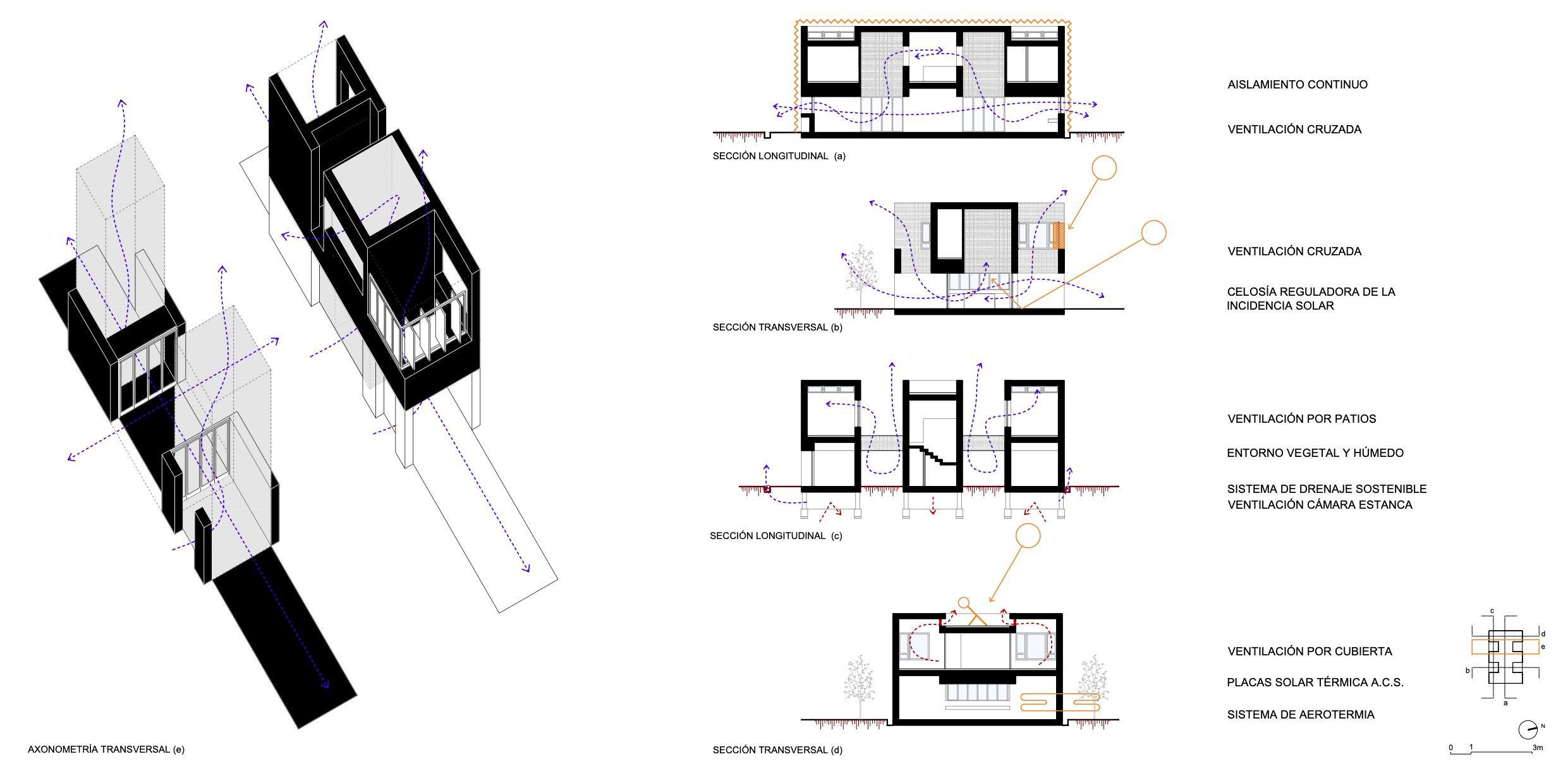 La casa está envuelta en un aislamiento continuo evitando por completo los puentes térmicos. Se utiliza aerotermia en climatización y energía solar para el agua caliente sanitaria. Se crean unos parasoles para evitar la radiación directa sobre los huecos de las estancias. La vivienda tiene ventilación cruzada a través de cada estancia. Cada espacio, habitaciones incluidas, tiene huecos enfrentados para permitir la circulación del aire. La incorporación de la naturaleza en los espacios exteriores, la disposición de los mínimos espacios pavimentados fomentando la filtración de aguas en el terreno natural y la integración de la piscina; permiten optimizar al máximo las posibilidades de mejora de acondicionamiento climático en una vivienda unifamiliar.