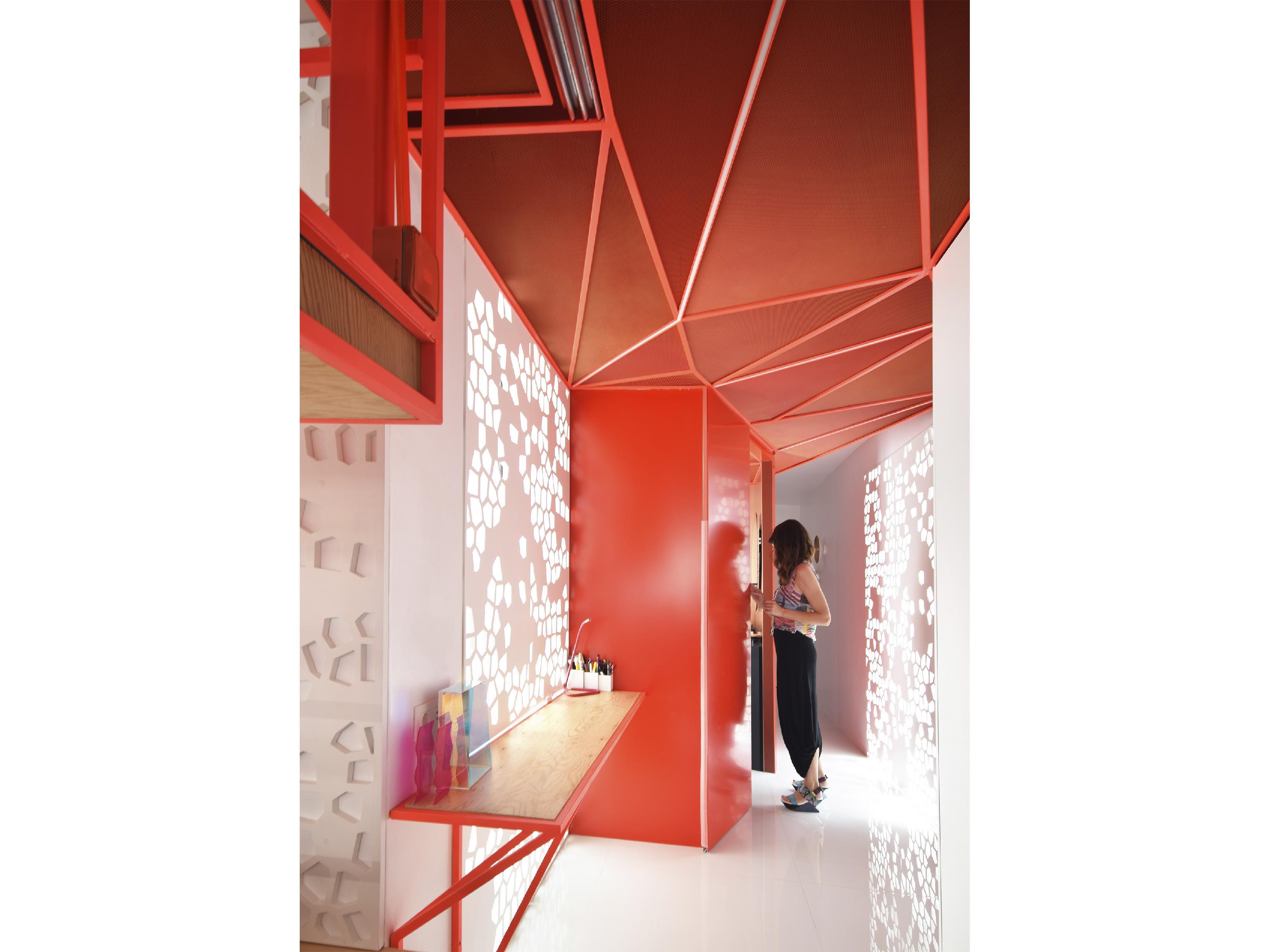 En las ventanas que dan a los patios se colocan celosías para generar intimidad, las formas se generan de la abstracción con una malla de polígonos de voronoi de una imagen del mar.